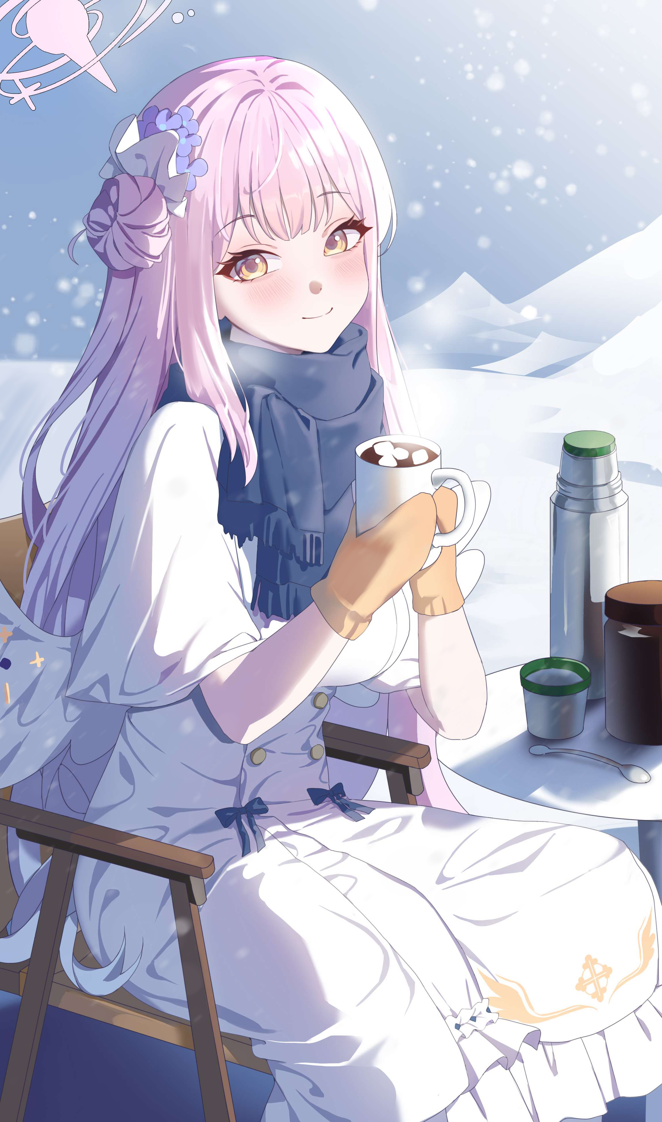 1girl absurdres black_scarf blue_archive blush capelet closed_mouth cup day dress flower ggoong_(pooplambgoong22) hair_bun hair_flower hair_ornament halo highres holding holding_cup long_hair looking_at_viewer mika_(blue_archive) mittens orange_mittens outdoors pink_hair pink_halo purple_flower scarf single_side_bun smile solo white_capelet white_dress yellow_eyes