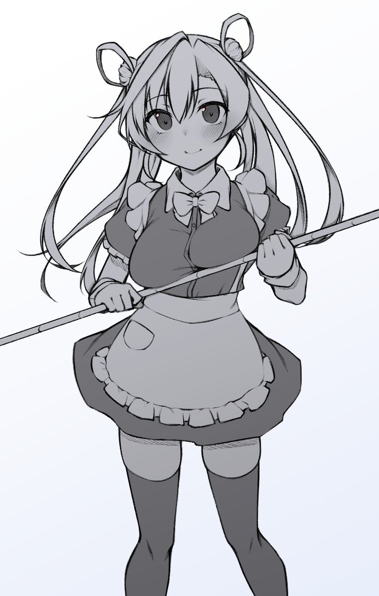 1girl abukuma_(kancolle) alternate_costume apron bow bowtie double_bun dress enmaided feet_out_of_frame hair_bun hair_rings kantai_collection long_hair looking_at_viewer maid monochrome smile solo standing stick thighhighs twintails yuki_to_hana