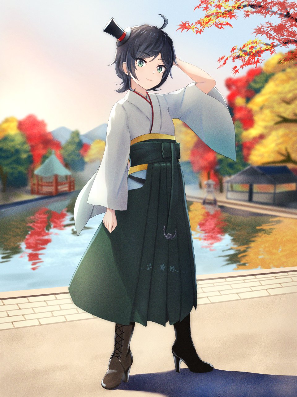 1girl ahoge autumn_leaves black_hair blue_sky boots cloud day full_body green_eyes green_hakama hakama hat highres japanese_clothes kantai_collection kimono kotou_yogen lace-up_boots lake leaf matsukaze_(kancolle) meiji_schoolgirl_uniform mini_hat mini_top_hat outdoors shadow short_hair sky smile solo standing swept_bangs top_hat tsurime wavy_hair white_kimono