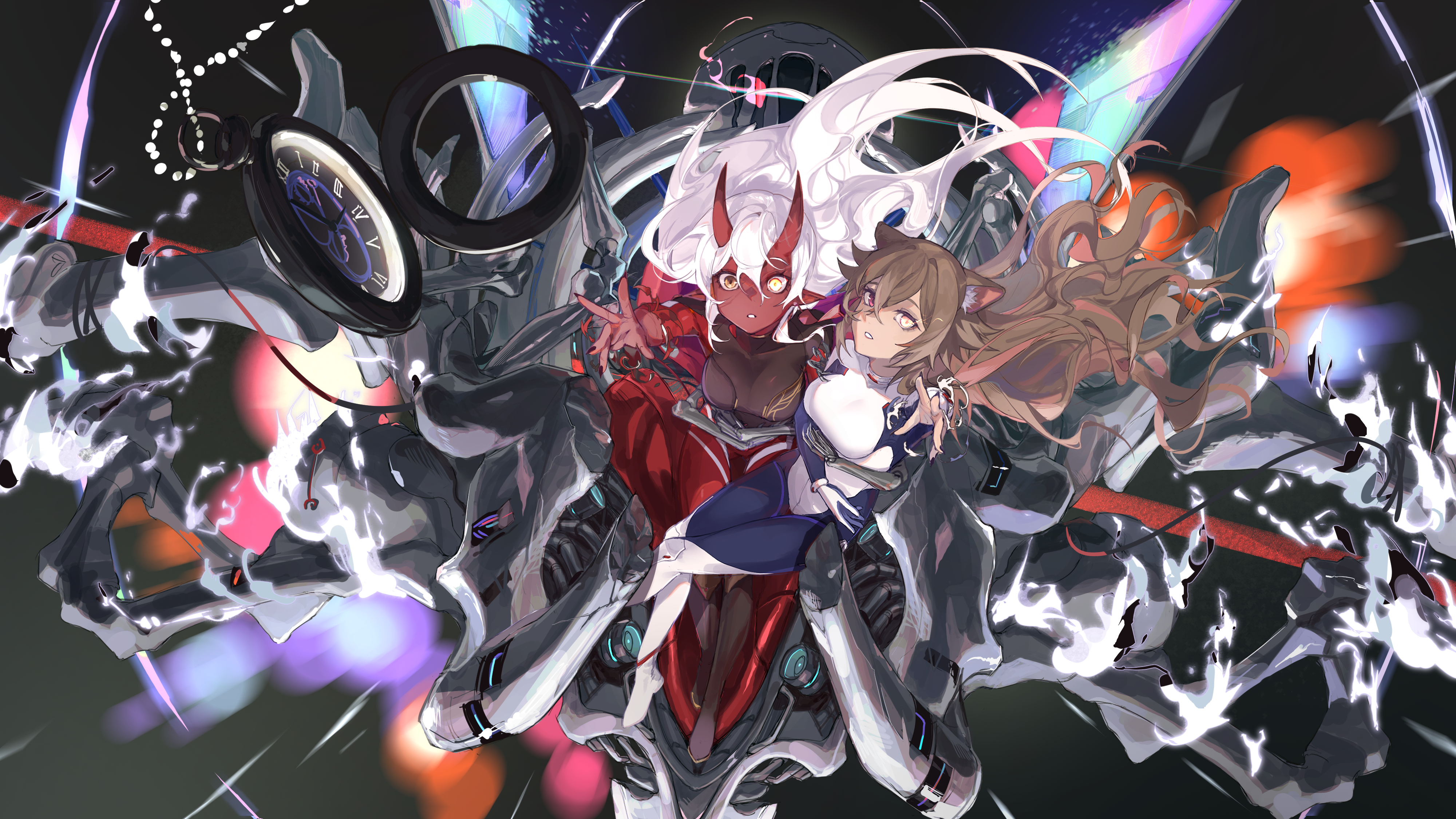 2girls absurdres akumi_(yoclesh) animal_ear_fluff black_footwear black_gloves bodysuit boots brown_hair character_request colored_skin commentary demon_girl demon_horns english_commentary explosion foreshortening gloves hair_between_eyes heterochromia highres horns kingcraft_kingu knee_boots long_hair looking_ahead mechanical_arms multiple_girls pocket_watch pointy_ears reaching reaching_towards_viewer red_bodysuit red_eyes red_skin sitting sitting_on_lap sitting_on_person tight_clothes torn_clothes torn_gloves virtual_youtuber vyugen watch wavy_hair white_hair wide-eyed yellow_eyes