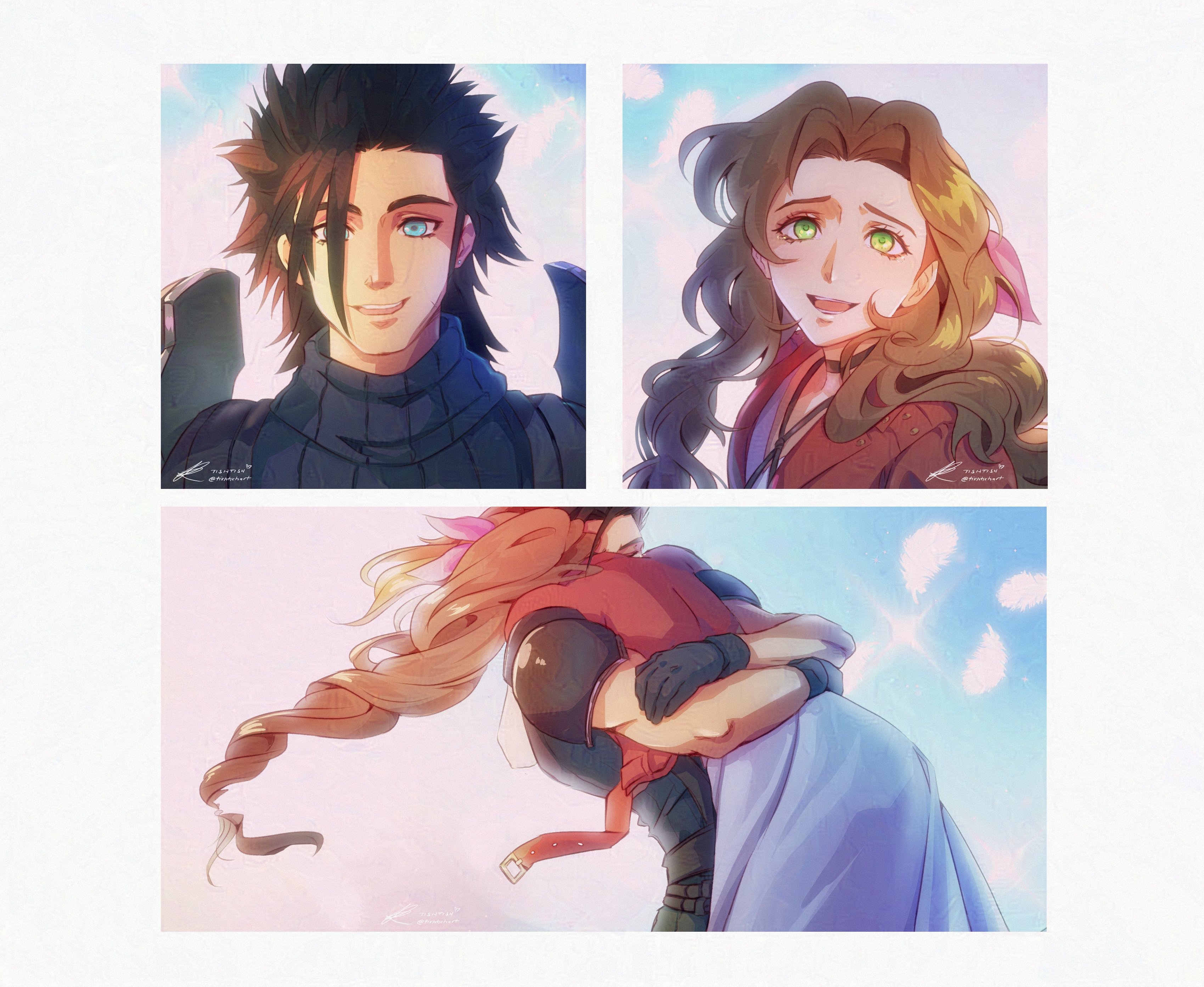 1boy 1girl absurdres aerith_gainsborough armor black_gloves black_hair blue_eyes blue_sweater braid braided_ponytail brown_hair choker couple dress final_fantasy final_fantasy_vii final_fantasy_vii_remake floating_hair gloves green_eyes hair_pulled_back hair_ribbon highres hug jacket long_hair looking_at_another open_mouth outdoors parted_bangs pink_ribbon pov red_jacket ribbed_sweater ribbon shoulder_armor sleeveless sleeveless_turtleneck smile spiked_hair square_enix sweater tishtish turtleneck turtleneck_sweater zack_fair