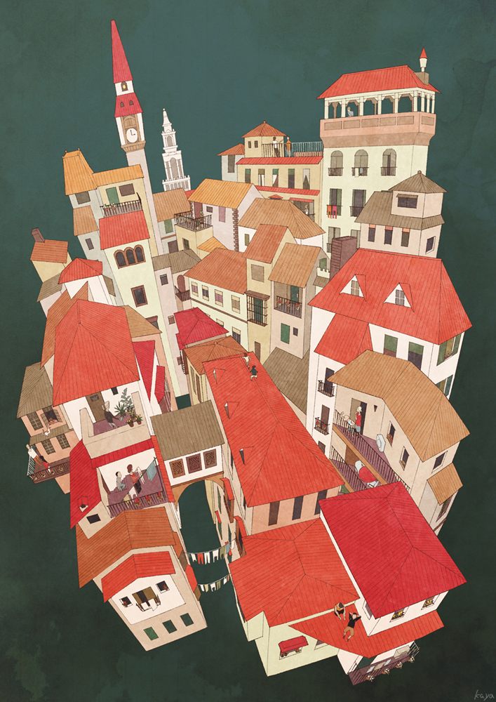 6+others artist_name balcony building cityscape clock clock_tower drying drying_clothes green_background kaya_(gooseflesh) multiple_others no_humans on_rooftop original scenery simple_background tower town