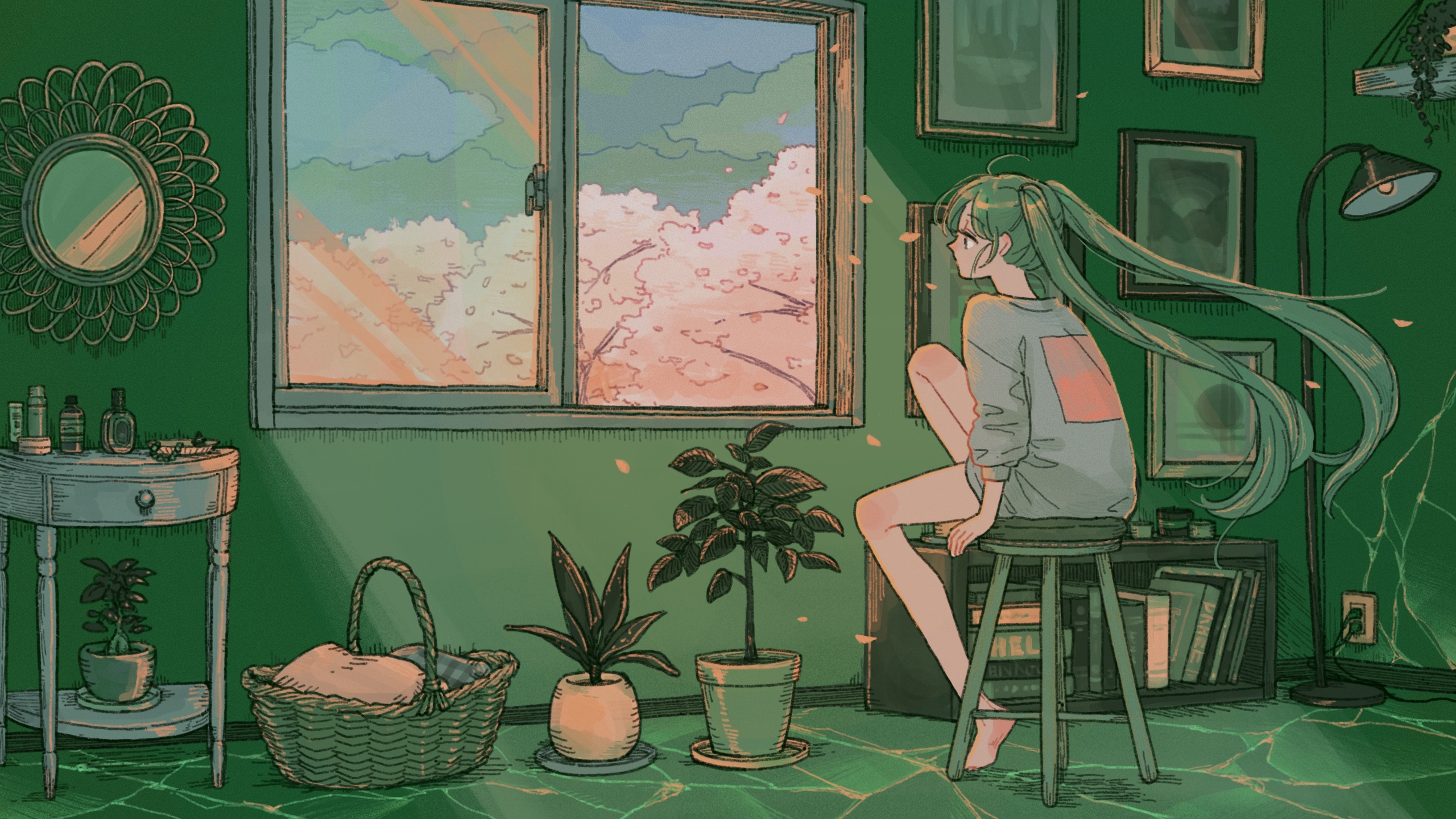 1girl ahoge aqua_hair barefoot basket blue_shirt book bookshelf bottle cable cherry_blossoms cloud cloudy_sky commentary_request cosmetics electrical_outlet floating_hair flower_pot hanging_plant hatsune_miku highres indoors knee_up lamp long_hair long_sleeves looking_outside mirror on_stool petals picture_frame pink_petals plant port_(portzzz) potted_plant profile shirt sidelocks sky sleeves_rolled_up solo stool table tree twintails vase very_long_hair vocaloid window