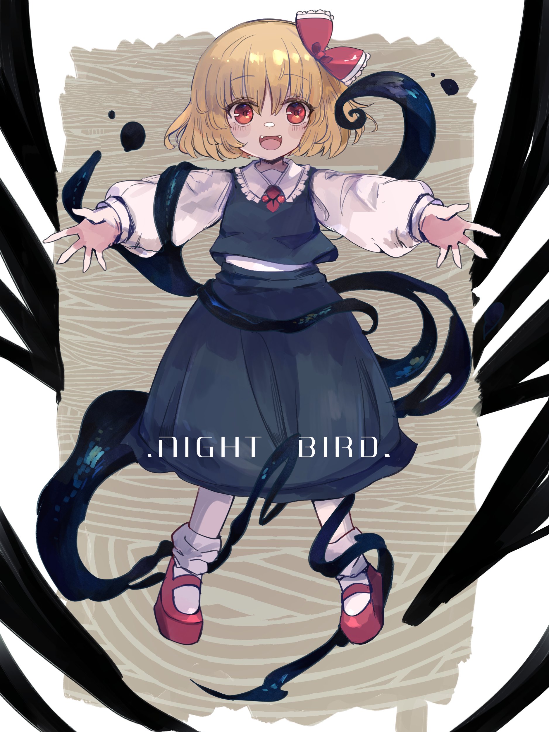 1girl absurdres black_skirt black_vest blonde_hair blush collared_shirt fangs full_body hair_between_eyes hair_ribbon highres long_sleeves looking_at_viewer nagomibako_(nagomi-99) open_mouth red_eyes red_footwear red_ribbon ribbon rumia shirt shores short_hair skirt smile socks solo touhou vest white_shirt white_socks