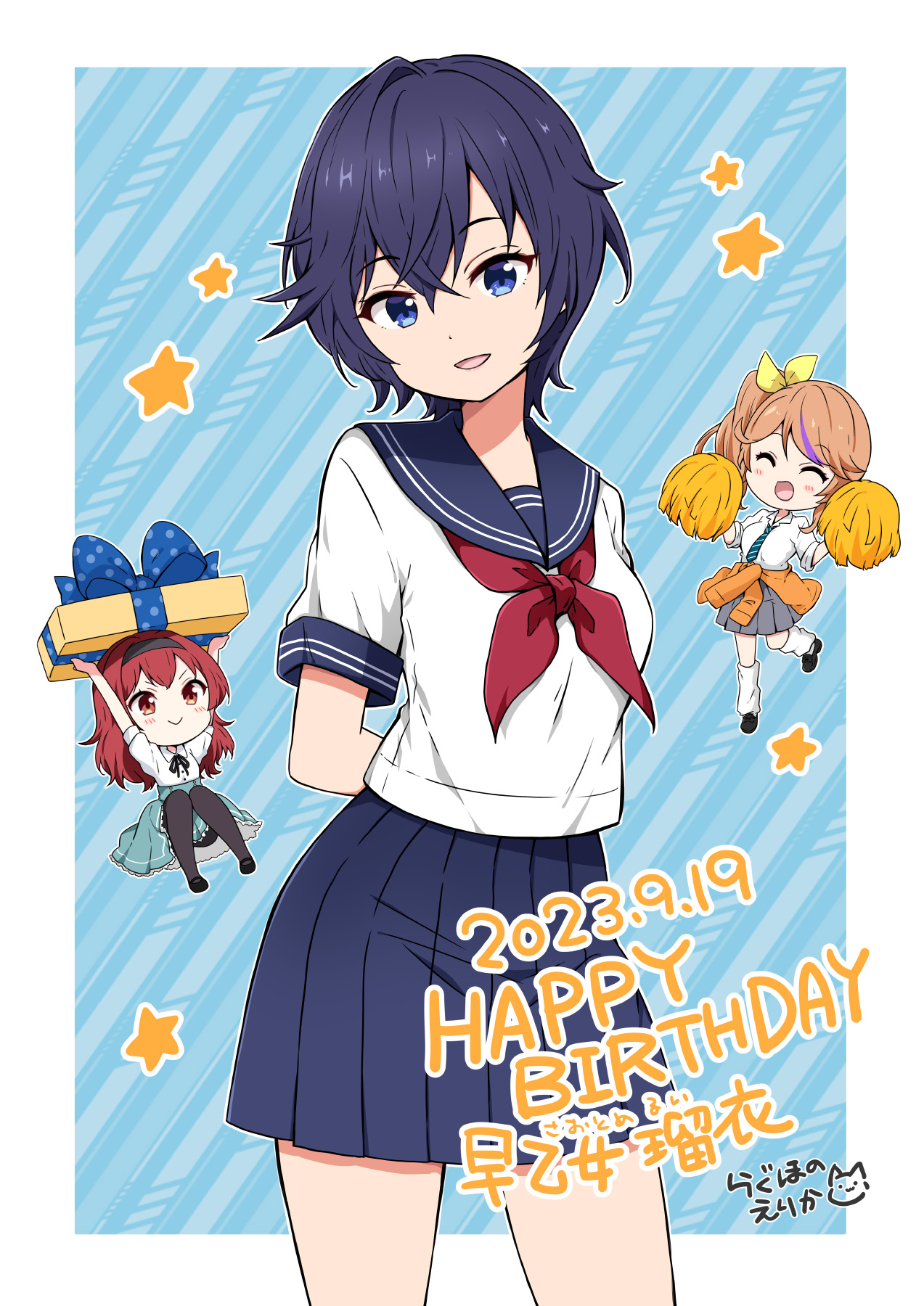 3girls arms_behind_back black_footwear black_pantyhose black_ribbon blue_bow blue_eyes blue_hair blue_sailor_collar blue_skirt blush bow character_name chibi closed_eyes clothes_around_waist collared_shirt gift green_necktie green_skirt grey_skirt hair_bow hairband happy_birthday highres holding holding_gift holding_pom_poms ichijo_seira koishikawa_emma leg_warmers loafers long_hair looking_at_viewer mary_janes messy_hair multicolored_hair multiple_girls neck_ribbon neckerchief necktie open_mouth orange_hair pantyhose pleated_skirt pom_pom_(cheerleading) pom_poms ragho_no_erika red_eyes red_hair red_neckerchief ribbon sailor_collar saotome_rui_(sousai_shoujo_teien) school_uniform shirt shoes short_hair short_sleeves side_ponytail signature sitting skirt smile sousai_shoujo_teien star_(symbol) streaked_hair striped_background striped_clothes striped_necktie sweater sweater_around_waist thighs white_shirt yellow_bow