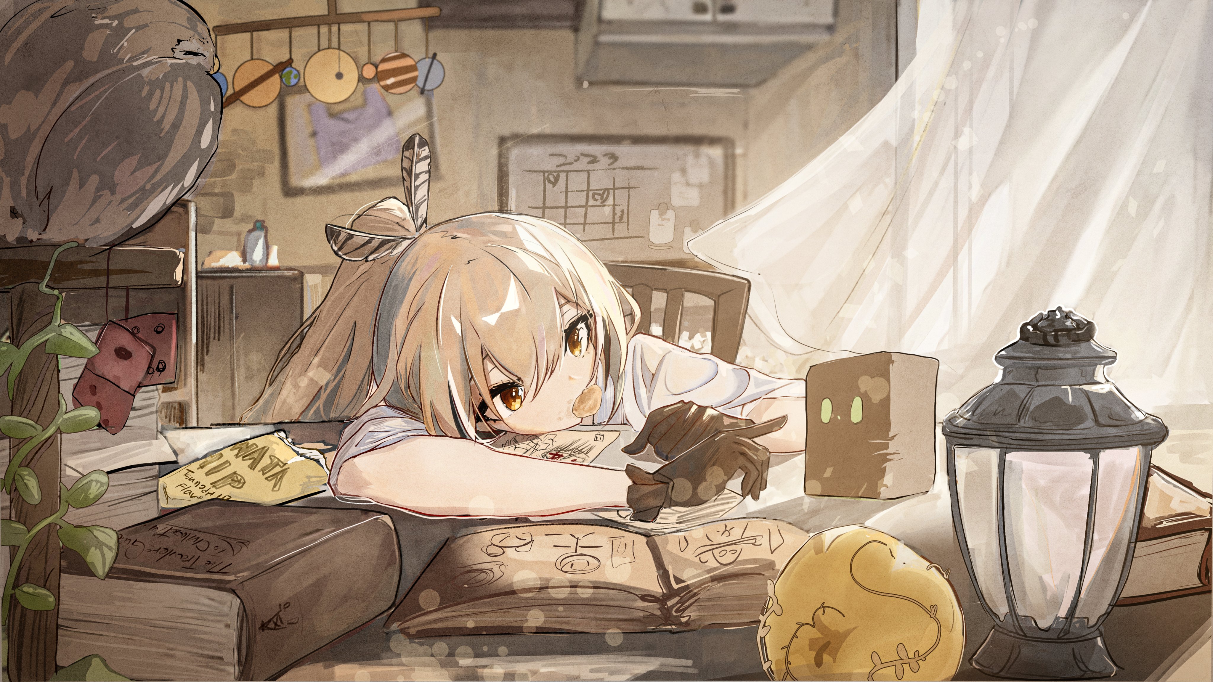 1girl absurdres apple bird blurry bokeh book brown_eyes brown_hair cabinet chair chips_(food) crossed_bangs curtains depth_of_field dice eating food food_in_mouth friend_(nanashi_mumei) fruit gloves golden_apple head_rest highres hololive hololive_english lantern leaning_on_table mobile multicolored_hair nanashi_mumei nanashi_mumei_(1st_costume) nereb_72 open_book owl planet potato_chips shirt sleeping streaked_hair table virtual_youtuber white_shirt whiteboard wooden_chair