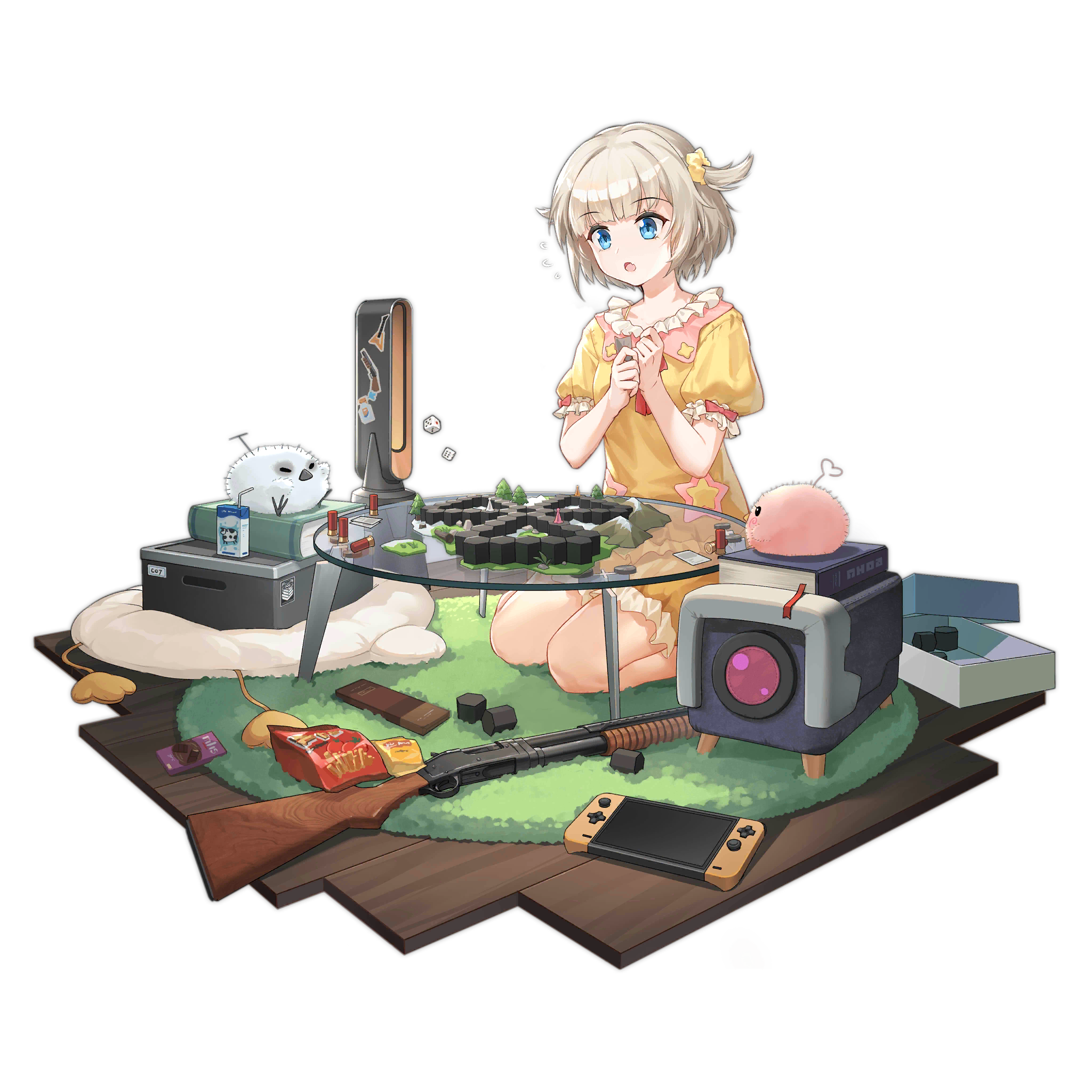 1girl :o ammunition bag bare_arms bare_legs bird bladeless_fan blonde_hair blue_eyes board_game book box chilunchilun dice drink_carton full_body girls'_frontline griffin_&_kryuger_logo gun hair_ornament hair_scrunchie highres juice_box kneeling m1897_(forest_game)_(girls'_frontline) m1897_(girls'_frontline) nintendo_switch official_alternate_costume official_art open_box open_mouth own_hands_together pajamas pink_bird pump_action rug scrunchie seiza short_hair short_sleeves shotgun shotgun_shell simple_background sitting snack solo star_(symbol) sticker third-party_source transparent_background weapon white_bird winchester_model_1897 wooden_floor yellow_pajamas yellow_scrunchie