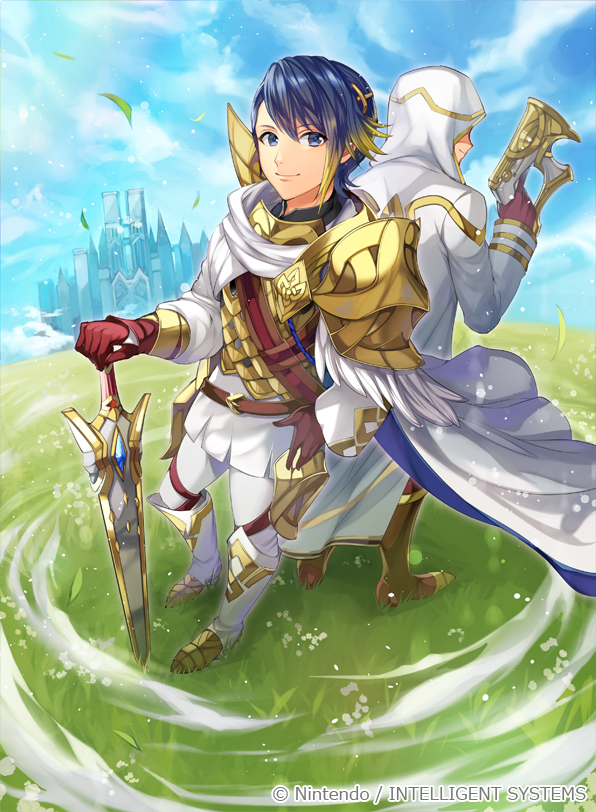alfonse_(fire_emblem) armor blue_hair cape castle commentary_request faceless faceless_male feather_trim fire_emblem fire_emblem_cipher folkvangr gloves grass gun holding holding_gun holding_weapon hooded_robe kiran_(fire_emblem) male_kiran_(fire_emblem) leather leather_gloves matsurika_youko multicolored_hair nintendo outdoors robe scale_armor streaked_hair weapon