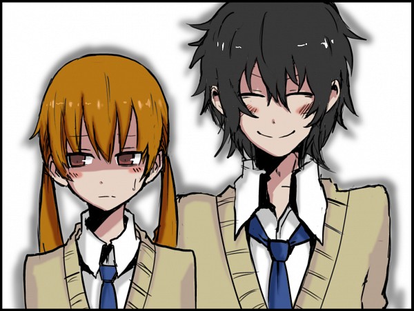 1boy 1girl black_hair blush brown_eyes brown_hair closed_eyes happy itoshiki_eru mizutani_shizuku school_uniform tonari_no_kaibutsu-kun twintails yoshida_haru