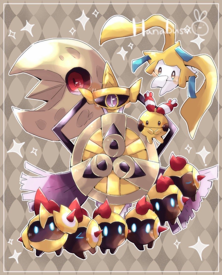 >_< aegislash animal_focus argyle_background argyle_clothes artist_name blue_eyes border chingling colored_skin commentary_request crescent_moon falinks floating gen_3_pokemon gen_4_pokemon gen_6_pokemon gen_8_pokemon hanabusaoekaki jirachi legendary_pokemon lunatone moon mythical_pokemon nintendo no_humans pokemon pokemon_(creature) purple_eyes red_eyes shield slit_pupils solid_oval_eyes sparkle tanzaku v-shaped_eyebrows white_border white_skin yellow_skin