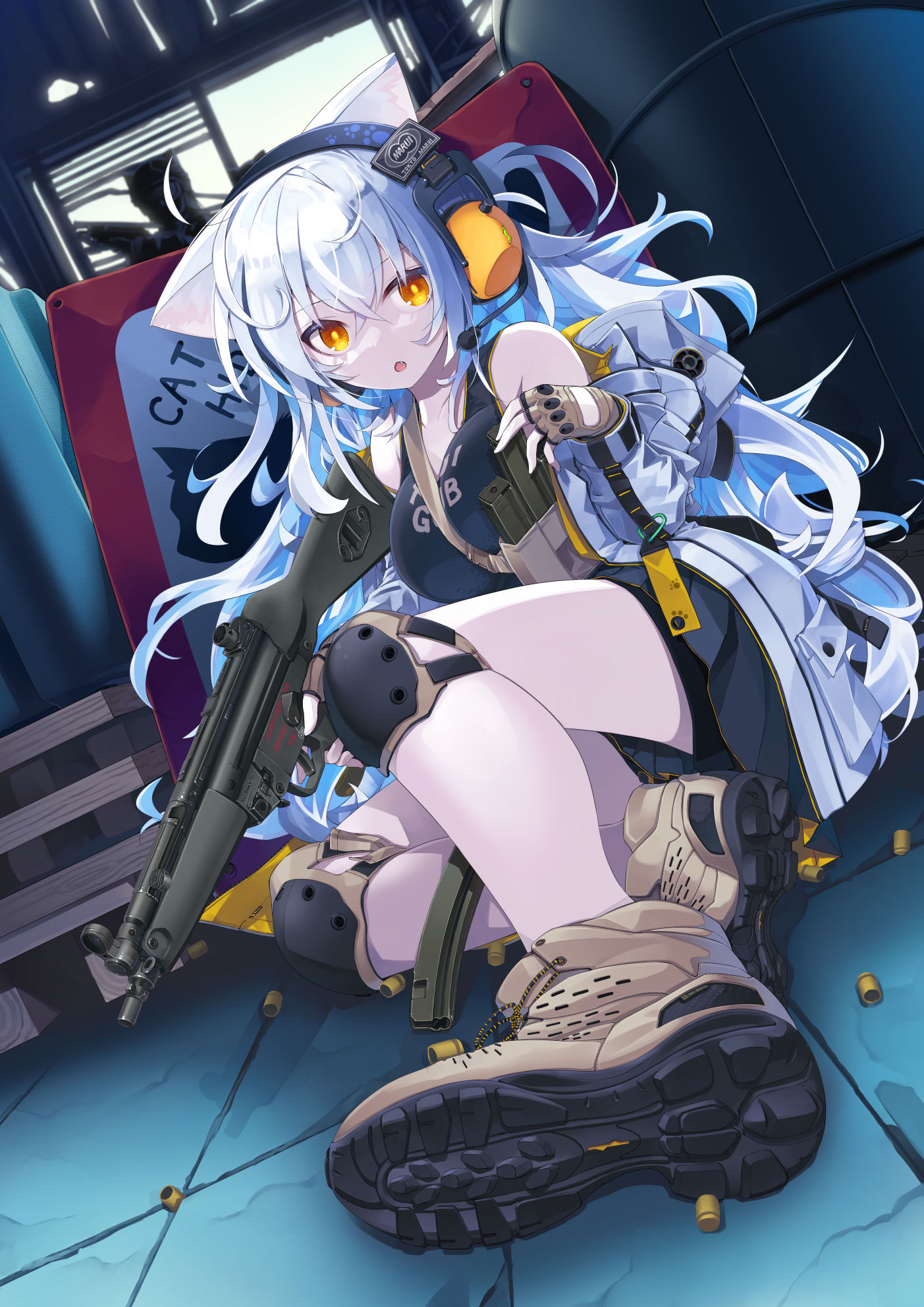 1girl blue_hair blue_shirt breasts brown_gloves cat_girl drum_(container) fingerless_gloves gloves gun h&k_mp5 highres jacket looking_at_viewer medium_breasts nanaroku_(fortress76) orange_eyes original shell_casing shirt solo submachine_gun weapon white_jacket