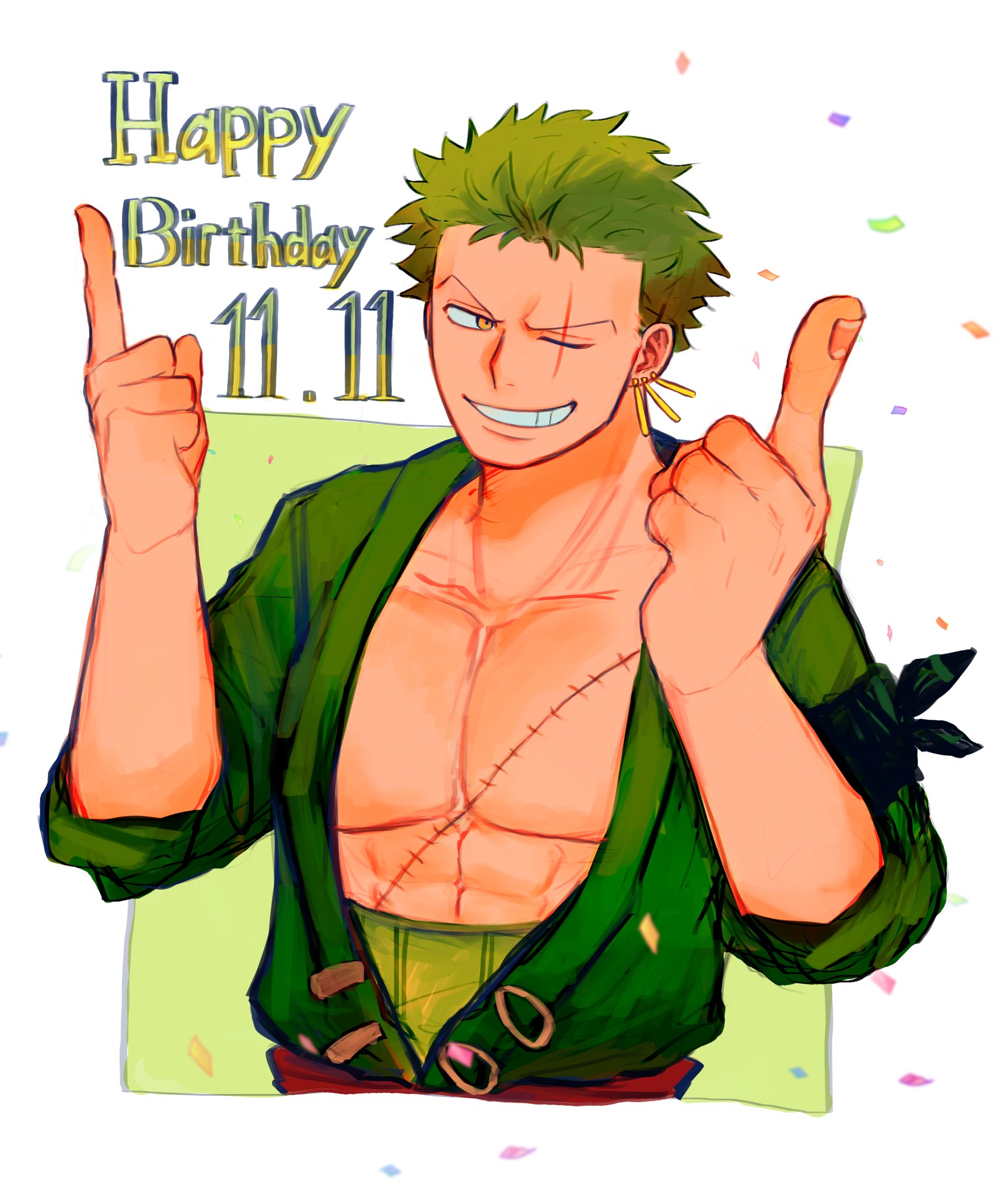 1boy aoiaoba0316 cropped_torso dated green_hair grin happy_birthday highres index_finger_raised japanese_clothes kimono male_focus one_piece open_clothes open_kimono pectoral_cleavage pectorals roronoa_zoro scar scar_across_eye scar_on_face short_hair smile solo