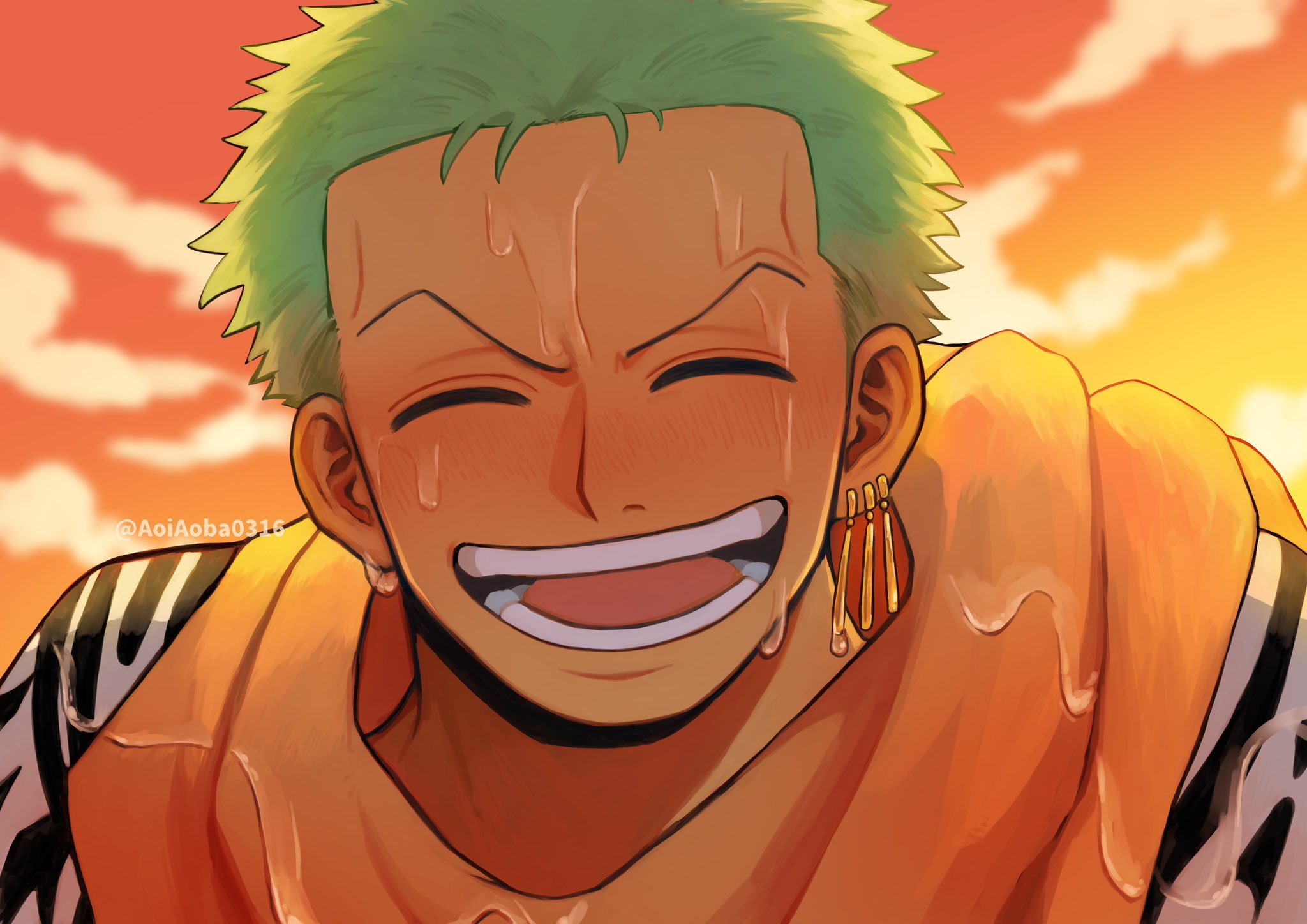 1boy :d ^_^ aoiaoba0316 blush closed_eyes facing_viewer green_hair highres male_focus official_alternate_costume one_piece open_mouth orange_sky portrait roronoa_zoro scarf short_hair sky smile solo sweat