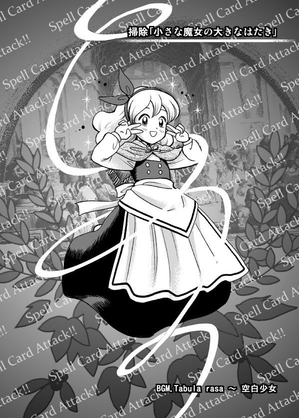 1girl 2girls :d apron capelet commentary_request curly_hair danmaku double_v ellen_(touhou) full_body gameplay_mechanics greyscale houzuki_(hotondo) long_hair magician's_aerial_dream monochrome multiple_girls open_mouth skirt smile solo spell_card takemoto_izumi_(style) touhou touhou_(pc-98) translation_request v vest waist_apron zun_(style)