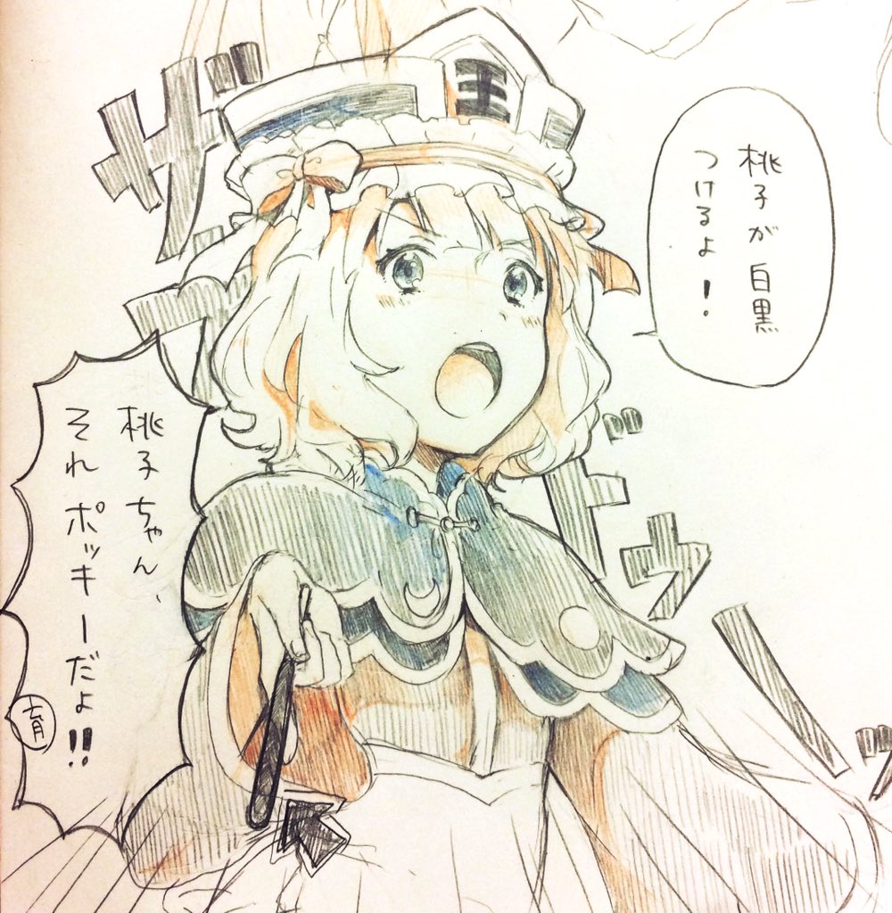 1girl arrow_(symbol) black_capelet black_hat blonde_hair blue_eyes blunt_bangs blush_stickers bow capelet collared_capelet colored_pencil_(medium) commentary_request cosplay crescent_print emphasis_lines eyelashes food frilled_bow frills hat hat_bow high-waist_skirt holding holding_food holding_pocky idolmaster idolmaster_million_live! lapels long_sleeves looking_at_viewer open_mouth photo_(medium) pocky pointing pointing_at_viewer red_bow red_shirt shiki_eiki shiki_eiki_(cosplay) shirt short_hair skirt solo speech_bubble suou_momoko teeth touhou traditional_media translation_request upper_body upper_teeth_only v-shaped_eyebrows wavy_hair white_skirt wide_sleeves witoi_(roa)