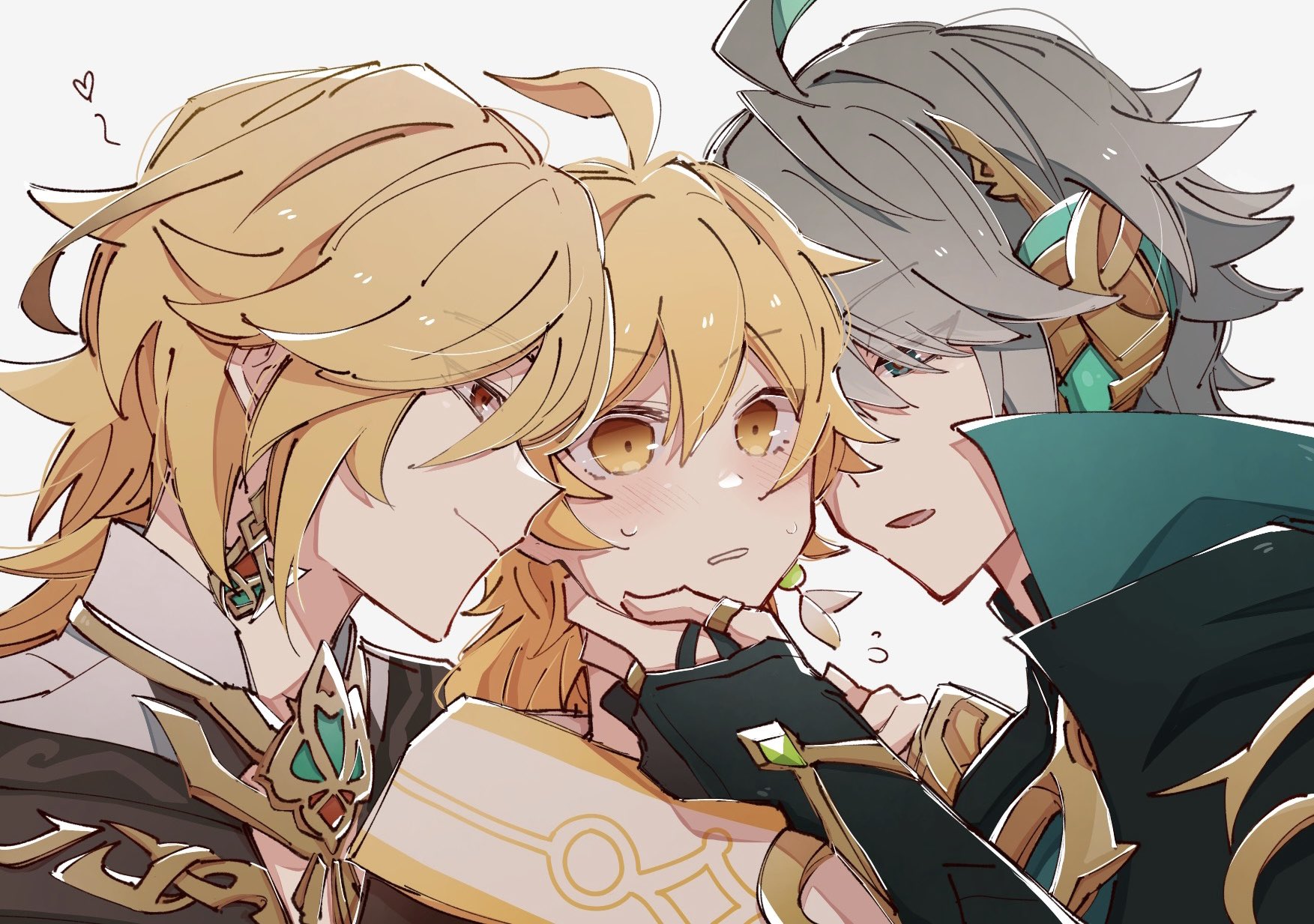 3boys aether_(genshin_impact) ahoge alhaitham_(genshin_impact) black_gloves blonde_hair blush braid braided_ponytail closed_mouth commentary_request earrings eyes_visible_through_hair flying_sweatdrops gem genshin_impact gloves gold_trim green_eyes green_gem grey_hair hair_between_eyes hair_over_one_eye hand_on_another's_chin hand_up headphones heart highres jewelry jifu_(gifu_7) kaveh_(genshin_impact) long_hair looking_at_another male_focus multiple_boys necklace open_mouth partially_fingerless_gloves profile red_eyes scarf shirt short_hair sidelocks simple_background single_braid single_earring smile sweat swept_bangs upper_body white_background white_scarf white_shirt yaoi yellow_eyes