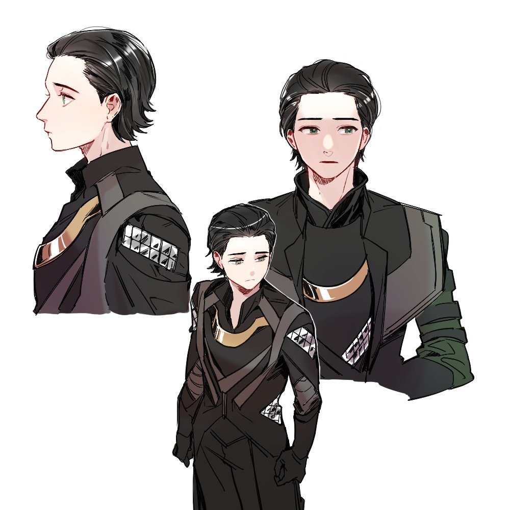 1boy black_gloves black_hair black_jacket black_pants black_shirt closed_mouth commentary_request gloves gold_trim green_eyes half-closed_eyes jacket korean_commentary loki_(marvel) long_sleeves looking_to_the_side male_focus marvel marvel mra_bong open_mouth pants shirt short_hair simple_background solo standing upper_body white_background