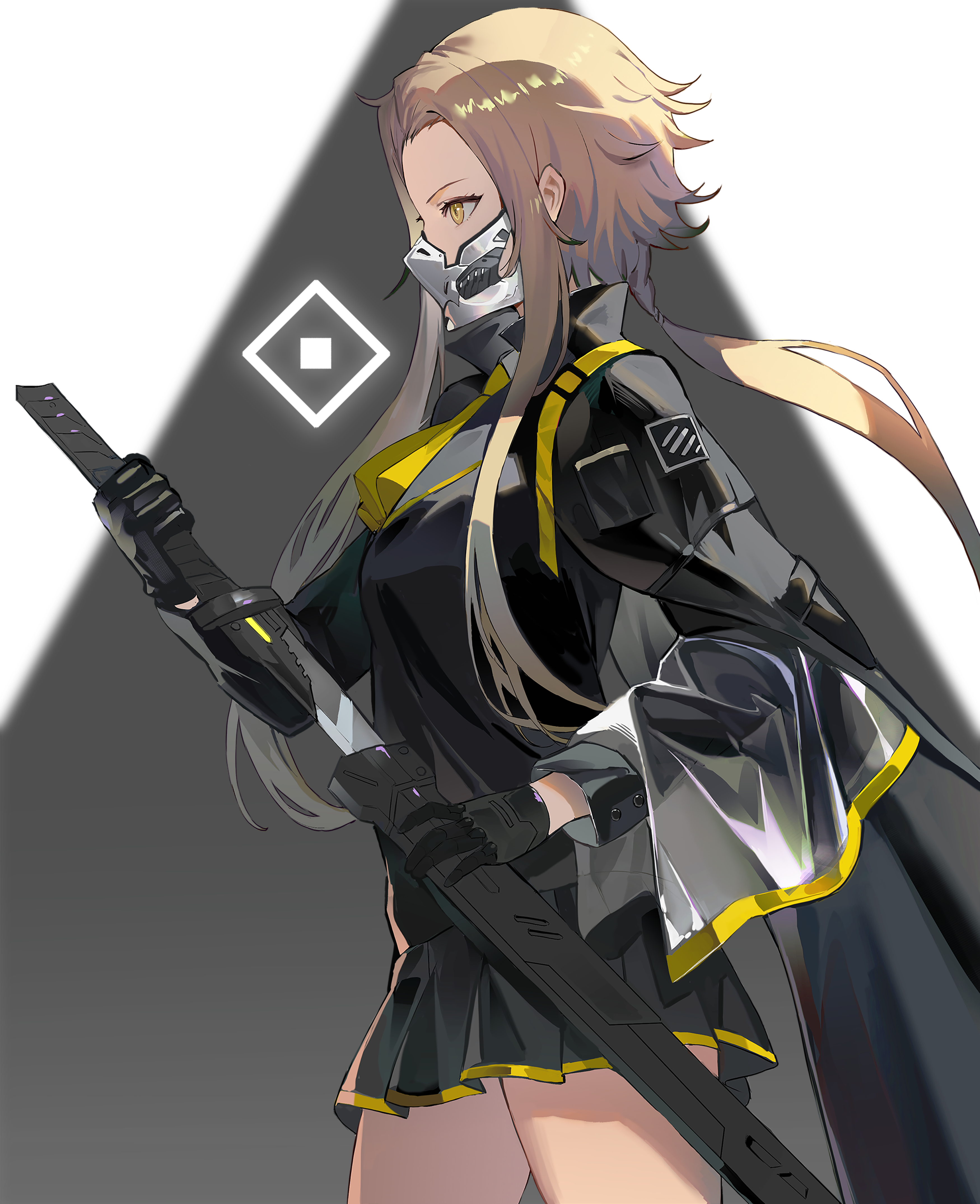 1girl absurdres black_gloves black_shirt black_skirt breasts brown_hair commentary cowboy_shot english_commentary from_side gloves high_collar highres holding holding_sheath holding_sword holding_weapon katana long_hair long_sleeves looking_afar looking_ahead low_ponytail mask medium_breasts mouth_mask neckerchief original pleated_skirt ponytail sheath shirt sidelocks skirt sl86 solo sword unsheathing weapon wide_sleeves yellow_eyes yellow_neckerchief