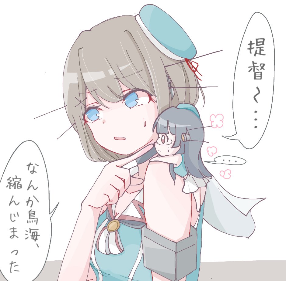 1girl aqua_headwear beret black_gloves black_hair blue_eyes blush breasts brown_hair choker choukai_(kancolle) choukai_kai_ni_(kancolle) glasses gloves gradient_clothes gradient_skirt green_headwear hair_ornament hairclip hat hat_ribbon headgear kantai_collection kintamaani_sanagi large_breasts long_hair maya_(kancolle) maya_kai_ni_(kancolle) midriff mini_hat mini_person minigirl navel pleated_skirt red_eyes ribbon rimless_eyewear short_hair skirt sleeveless sweatdrop white_skirt x_hair_ornament