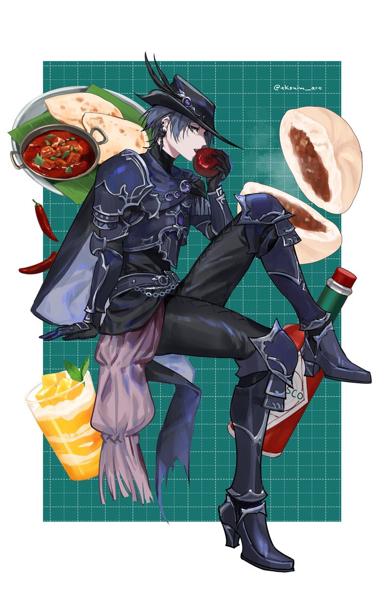 1girl androgynous apple arm_support armor black_cape black_gloves black_hair black_hat black_pants border bottle breastplate bun_(food) cape chili_pepper commentary cup curry drinking_glass ear_piercing earrings eating expressionless final_fantasy final_fantasy_xiv food from_side fruit full_body gloves greaves green_background grey_eyes hat hat_feather holding holding_food holding_fruit invisible_chair jewelry knee_pads knee_up looking_at_viewer open_mouth outside_border pants pauldrons piercing plate profile reaper_(final_fantasy) reverse_trap short_hair shoulder_armor signature simple_background sitting smoothie solo untranslatable_commentary tk_(tksnim) tricorne twitter_username white_border zero_(ff14)