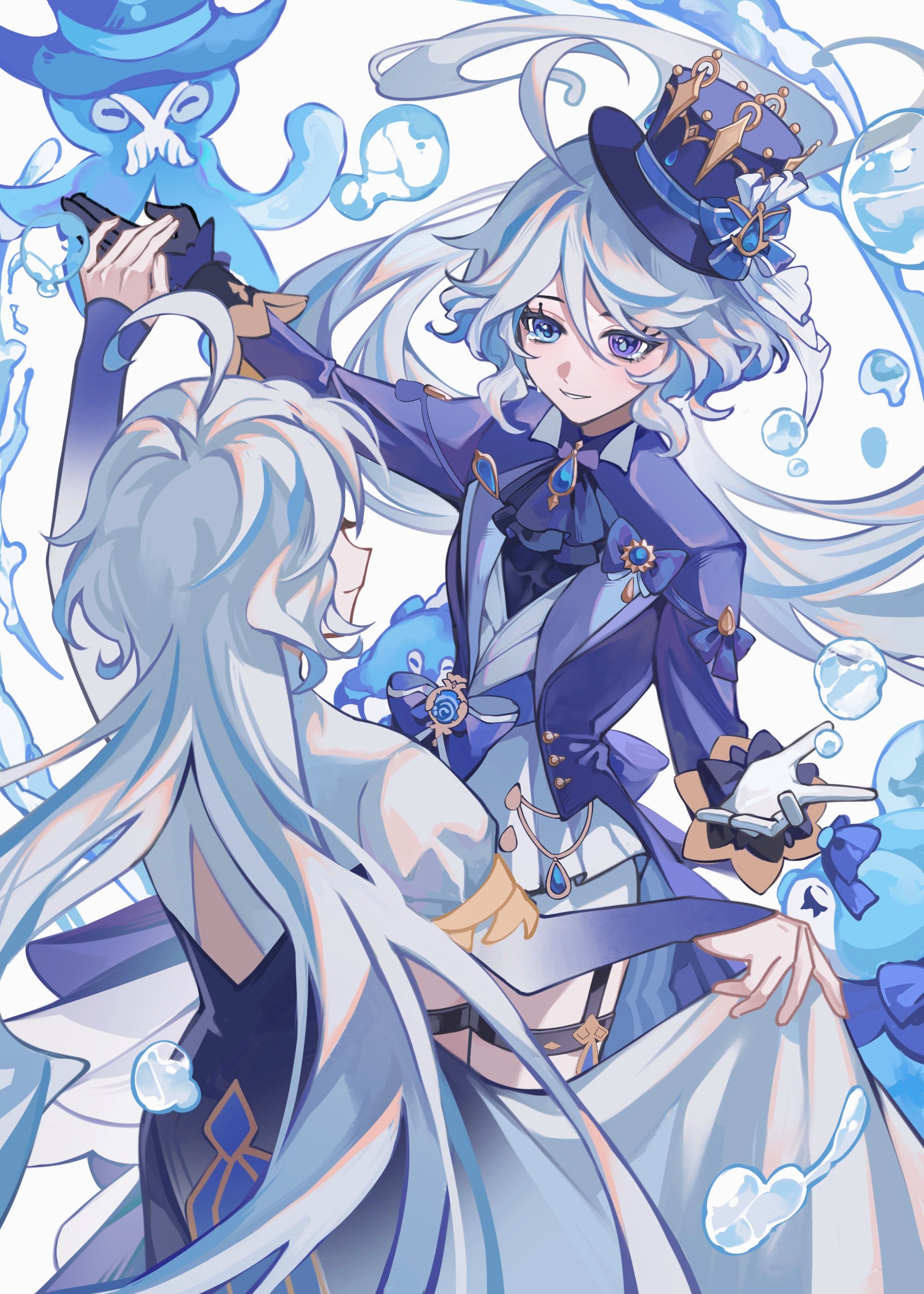 2girls absurdres ahoge air_bubble ascot asymmetrical_gloves black_gloves blue_ascot blue_eyes blue_hair blue_headwear blue_jacket blush brooch bubble closed_mouth dancing fingernails focalors_(genshin_impact) furina_(genshin_impact) genshin_impact gloves hair_between_eyes hat heterochromia highres jacket jewelry long_hair mismatched_gloves multicolored_hair multiple_girls sidelocks smile streaked_hair top_hat two-tone_hair unik0503 water white_gloves