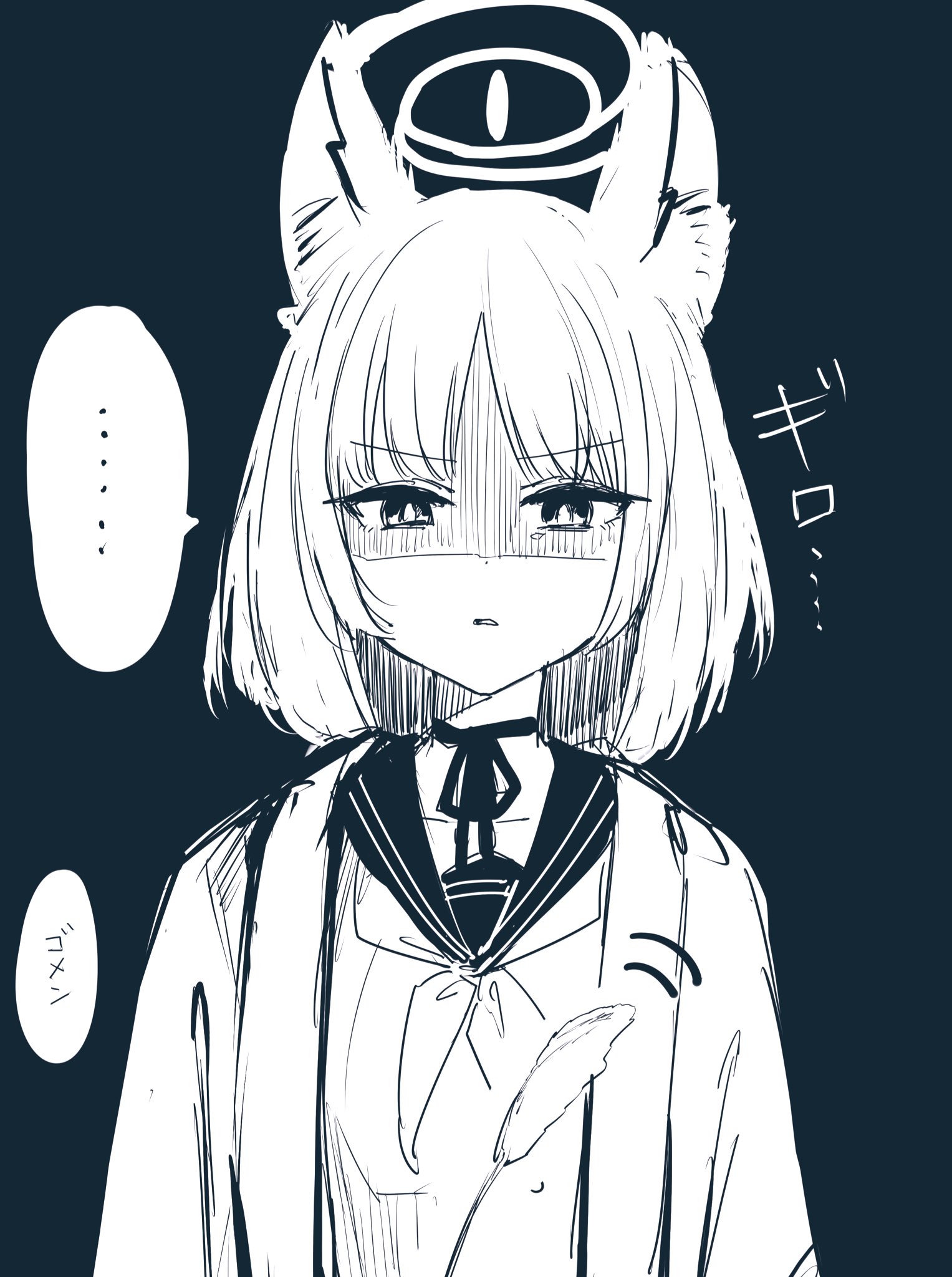 ... 1girl animal_ears blue_archive cat_ears cat_teaser choker halo haori highres japanese_clothes kikyou_(blue_archive) looking_at_viewer monochrome neckerchief parted_lips sailor_collar shaded_face short_hair solo spoken_ellipsis unot_227 upper_body v-shaped_eyebrows