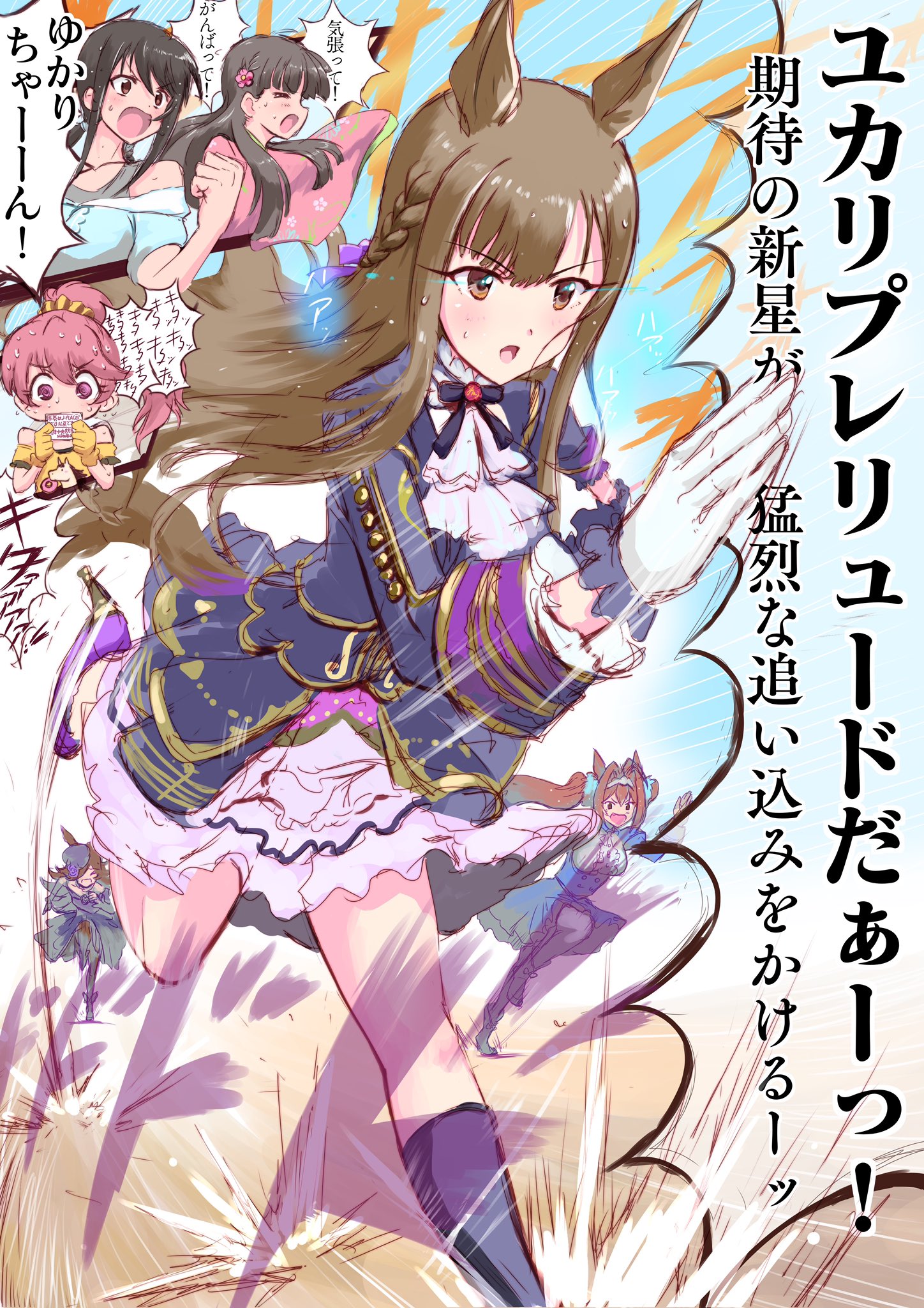 6+girls alternate_hairstyle animal_ears arachangram18 ascot asymmetrical_legwear black_socks blue_jacket blue_ribbon blunt_bangs blush bow braid breasts brown_eyes brown_hair crossover daiwa_scarlet_(umamusume) gloves hair_bow hair_ribbon hand_up high_heels highres horse_ears idolmaster idolmaster_cinderella_girls idolmaster_cinderella_girls_starlight_stage jacket kobayakawa_sae layered_skirt leg_up long_hair long_sleeves medium_breasts mismatched_legwear mizumoto_yukari multiple_girls nakano_yuka neck_ribbon open_mouth purple_footwear purple_ribbon ribbon rice_shower_(umamusume) running shiina_noriko single_braid single_sock skirt socks speech_bubble sweat umamusume v-shaped_eyebrows white_ascot white_gloves white_skirt