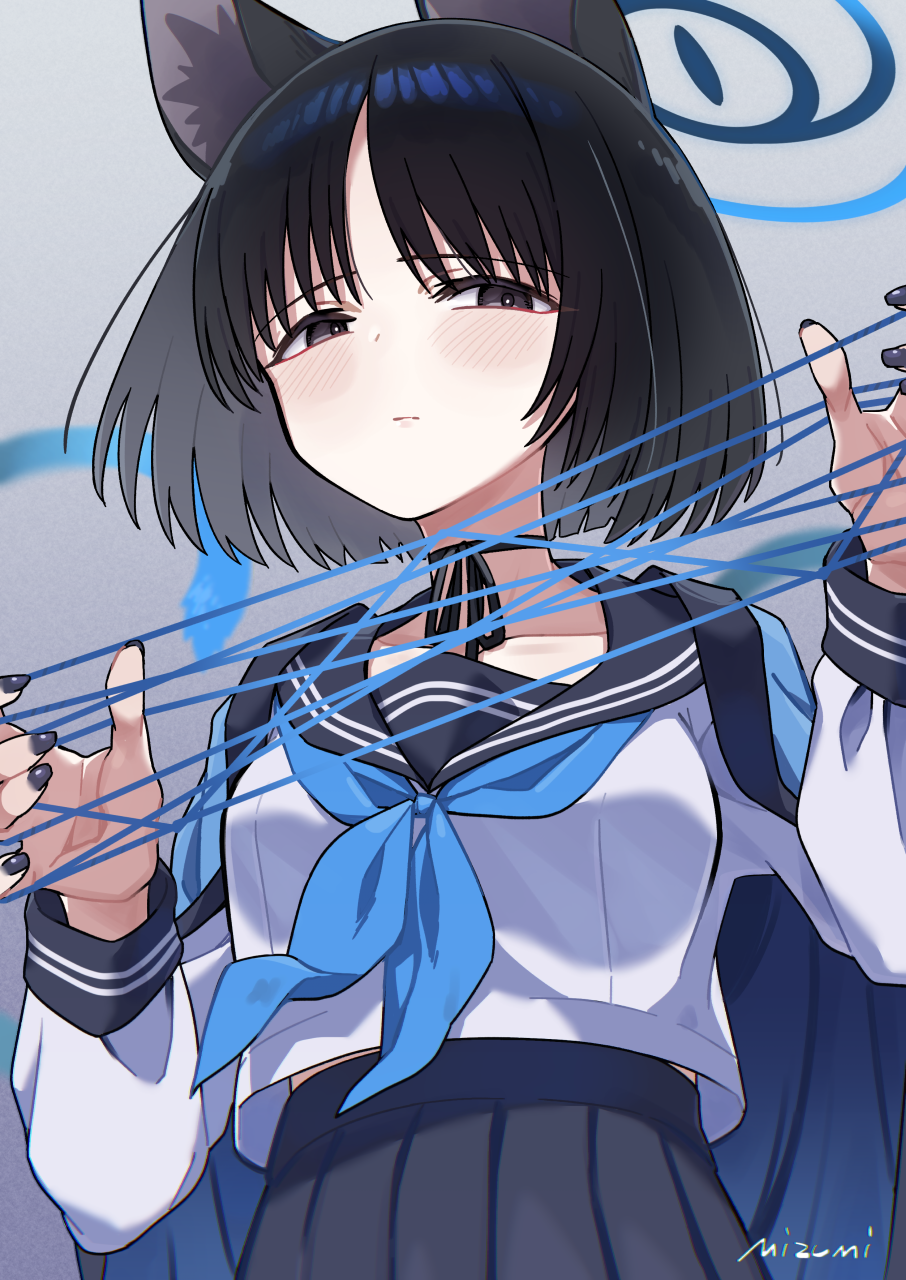 1girl animal_ears artist_name black_eyes black_hair black_nails black_sailor_collar black_skirt blue_archive blue_halo blue_neckerchief blush breasts cat's_cradle cat_ears closed_mouth collarbone fingernails halo haori highres japanese_clothes kikyou_(blue_archive) long_sleeves looking_at_viewer medium_breasts mizumi_(artist) nail_polish neckerchief pleated_skirt sailor_collar school_uniform serafuku short_hair signature skirt solo