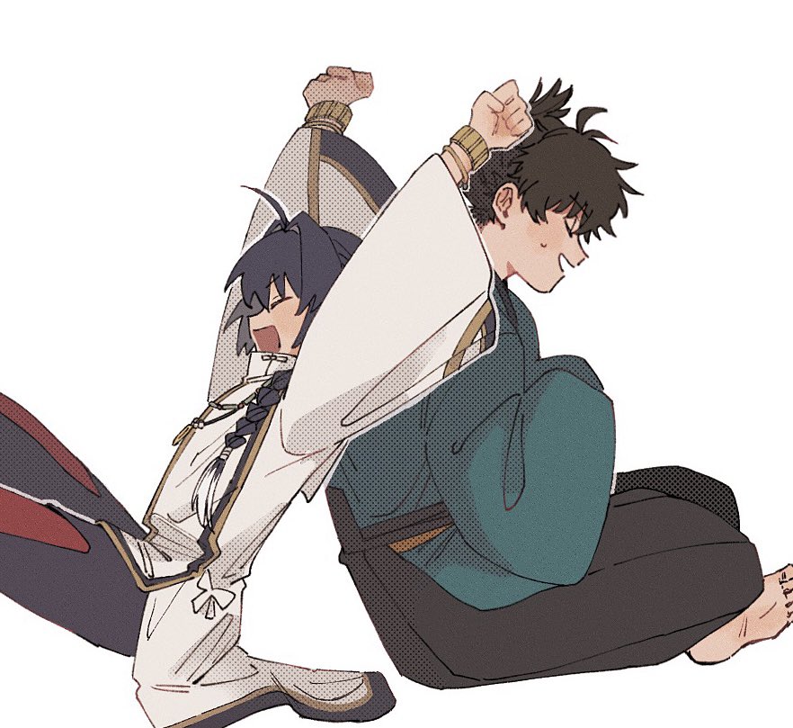 1boy 1other androgynous armlet back-to-back barefoot black_hair black_hakama blue_kimono bracelet braid braided_ponytail closed_eyes fate/samurai_remnant fate_(series) hair_intakes hakama indian_style japanese_clothes jewelry kimono long_hair miyamoto_iori_(fate) saber_(fate/samurai_remnant) sitting smile stretching topknot wide_sleeves yuu_(yuuka_8018)
