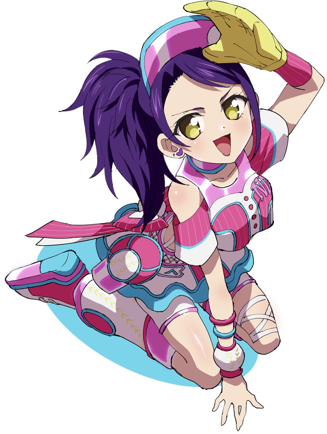 1girl :d arm_support arm_up bare_shoulders baseball_glove baseball_uniform bracelet commentary_request detached_sleeves edamame_(buruburu) full_body hand_up highres idol_clothes idol_time_pripara jewelry long_hair looking_at_viewer open_mouth pink_shirt pink_shoes pink_skirt pretty_series pripara purple_hair seiza shirt shoe_soles shoes side_ponytail sitting skirt smile solo sportswear toudou_shion visor_cap white_background yellow_eyes
