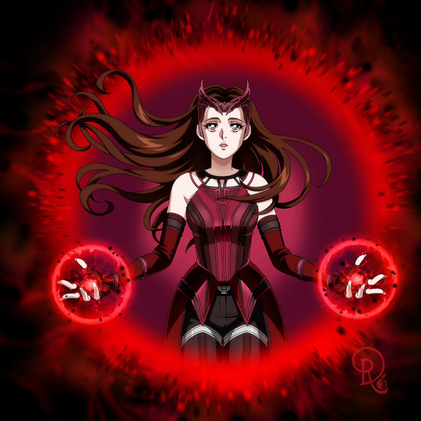 1girl breasts brown_eyes brown_hair commentary commission cowboy_shot drachea_rannak elbow_gloves english_commentary fingerless_gloves gloves highres long_hair magic marvel marvel medium_breasts scarlet_witch solo tiara wandavision watermark