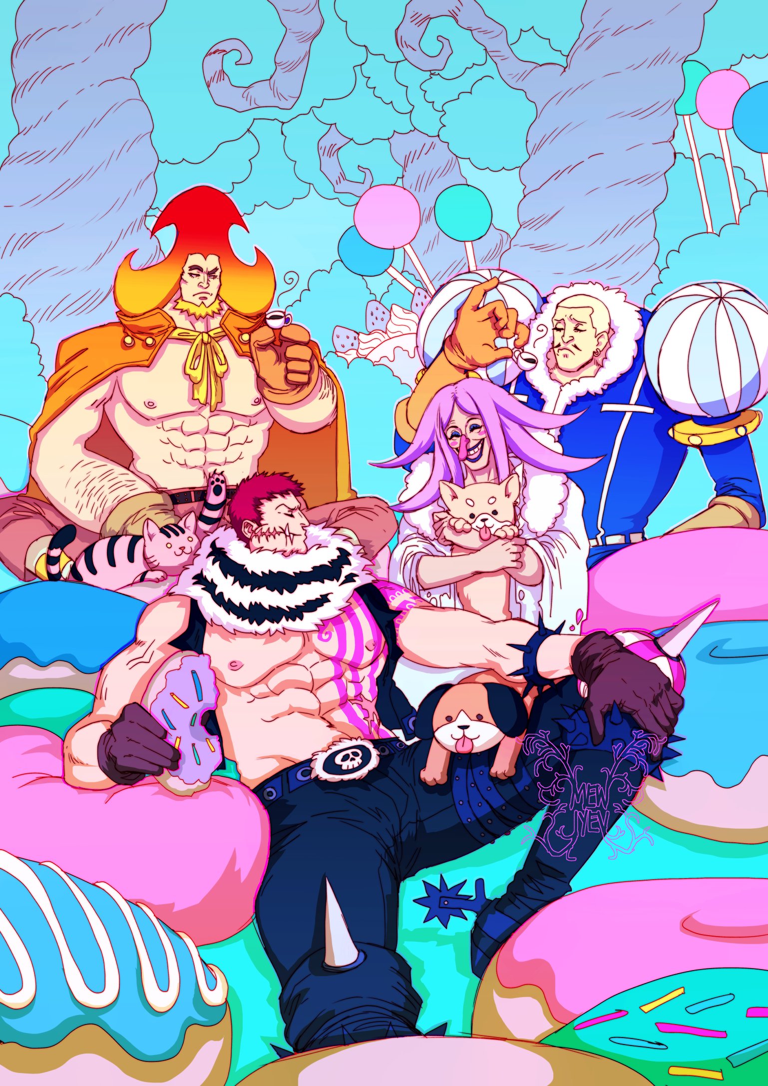 1girl 3boys :d abs animal animal_on_lap arm_hair bare_pectorals beard black_gloves blonde_hair blush bracelet buzz_cut candy cape cat charlotte_brulee charlotte_daifuku charlotte_katakuri charlotte_oven chest_tattoo closed_eyes coat covered_mouth cup dog donut earrings eating facial_hair food forked_eyebrows fur_collar gloves highres holding holding_animal holding_cup holding_food hot impossible_hair jewelry lipstick long_hair long_nose looking_to_the_side makeup mature_male mewiyev multiple_boys muscular muscular_male nipples on_lap one_piece open_clothes open_mouth open_vest orange_hair pants pectorals pencil_as_mustache pink_eyes pink_hair pink_pants purple_hair scar scar_on_face scarf short_hair shoulder_pads siblings sitting smile spiked_bracelet spikes stitches tattoo thick_eyebrows tree upper_body very_short_hair vest