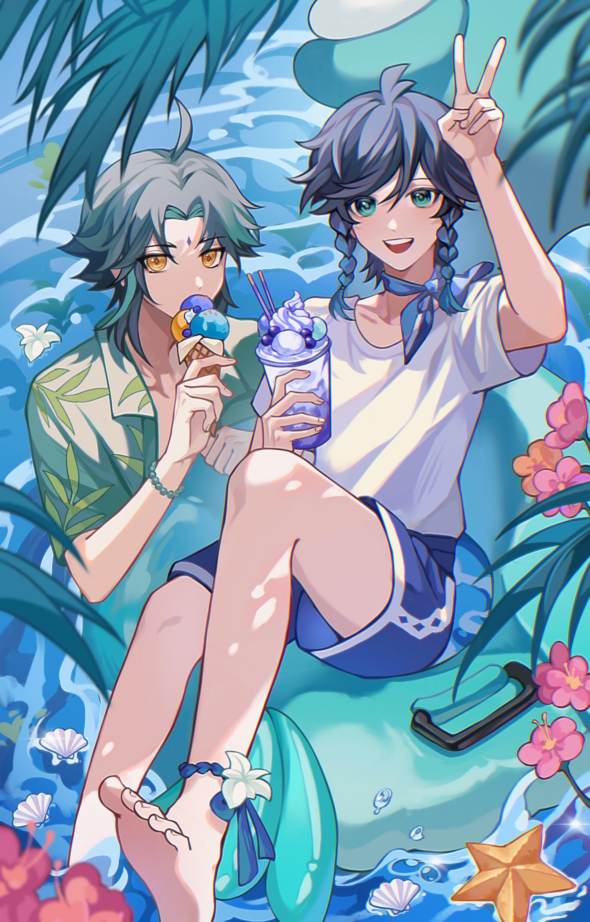 2boys absurdres alternate_costume bare_legs barefoot beads black_hair blue_hair blue_shorts blueberry braid cup facial_mark feet flower food forehead_mark fruit genshin_impact glass gradient_hair green_eyes green_hair green_shirt highres holding holding_cup holding_ice_cream_cone ice_cream ice_cream_cone innertube leaf_print male_focus multicolored_hair multiple_boys open_mouth shirt shorts smile swim_ring t-shirt teeth toes tongue twin_braids unik0503 v venti_(genshin_impact) water white_shirt wristband xiao_(genshin_impact) yellow_eyes