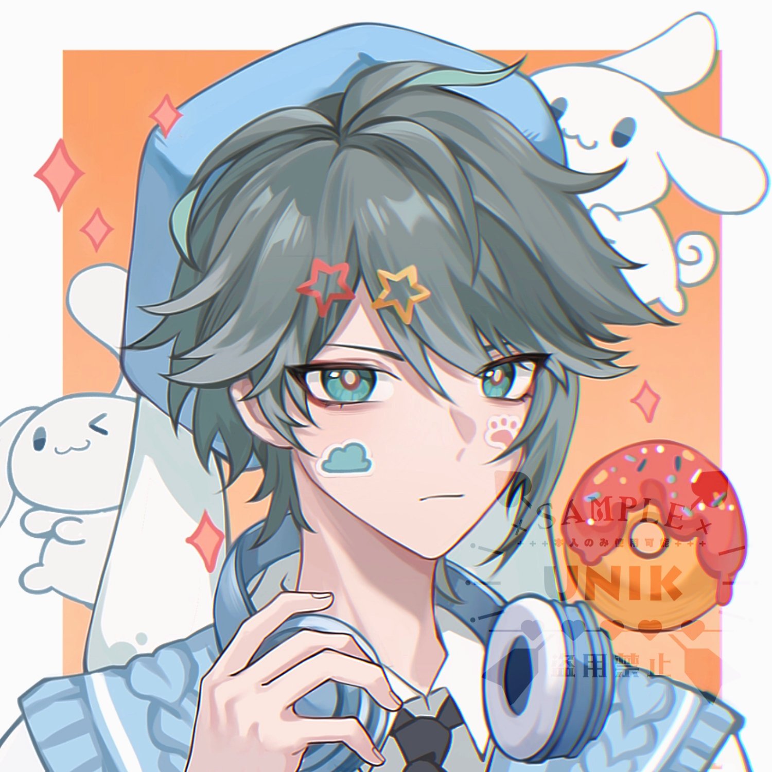 1boy alhaitham_(genshin_impact) alternate_costume aqua_eyes black_necktie blue_hat blue_vest cinnamoroll closed_mouth donut food fuwa_fuwa_cinnamoroll genshin_impact grey_hair hair_between_eyes hair_ornament hat headphones headphones_around_neck highres looking_at_viewer male_focus multicolored_hair necktie sanrio shirt short_hair solo star_(symbol) star_hair_ornament sticker sticker_on_face unik0503 vest white_shirt