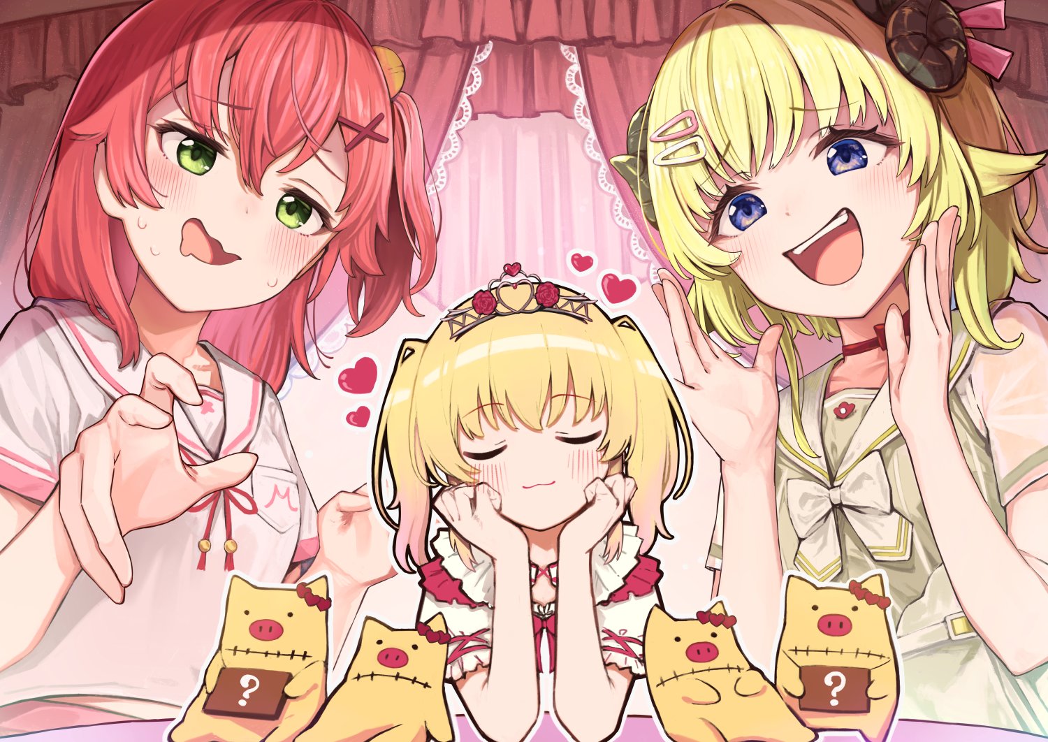 3girls akai_haato akai_haato_(6th_costume) animal_ears belt blonde_hair blush choker closed_eyes closed_mouth crown dress green_eyes haaton_(akai_haato) hair_ornament hairpin hololive horns long_hair looking_at_viewer medeshima_marota medium_hair multiple_girls official_alternate_costume open_mouth pink_hair pink_shirt pink_skirt ponytail purple_eyes red_choker ribbon_choker sakura_miko sakura_miko_(school_uniform) sheep_ears sheep_girl sheep_horns shirt side_ponytail skirt smile teeth tsunomaki_watame tsunomaki_watame_(street_casual) two_side_up upper_teeth_only virtual_youtuber white_belt white_dress white_shirt white_skirt x_hair_ornament