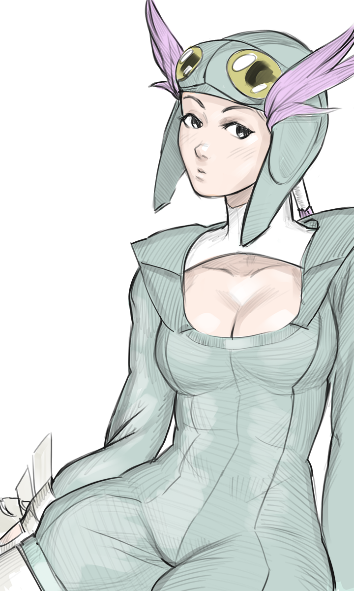 1girl cleavage_cutout clothing_cutout collarbone cowboy_shot drawfag goggles goggles_on_head helmet highres looking_to_the_side nintendo pink_hair pokemon pokemon_oras ponytail solo white_background winona_(pokemon)