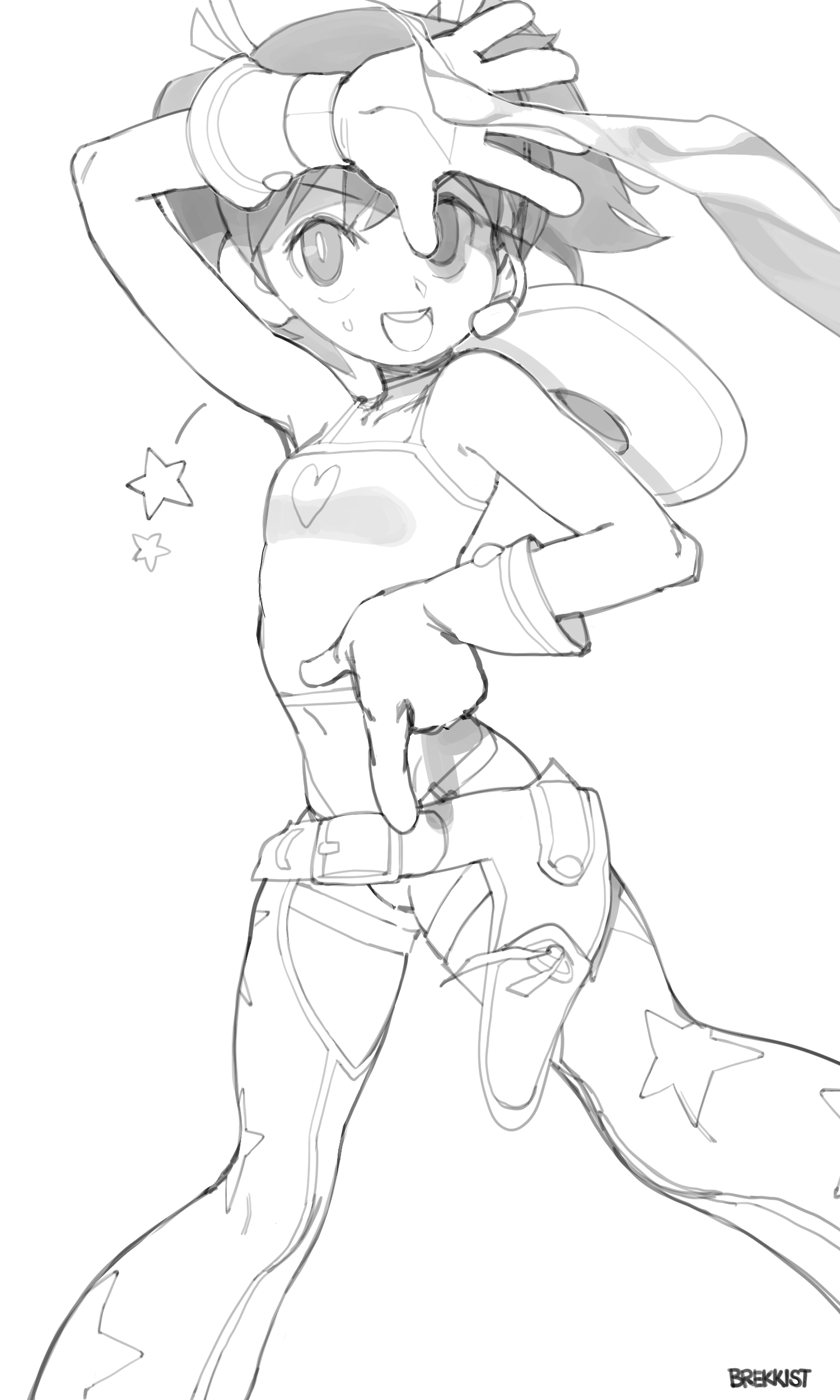 1girl absurdres arm_up armpits artist_name breasts brekkist cowboy_hat gloves hat highres legs looking_at_viewer midriff monochrome navel open_mouth panties pants saru_getchu sayaka_(saru_getchu) sleeveless small_breasts smile solo thighs traditional_media twintails underwear