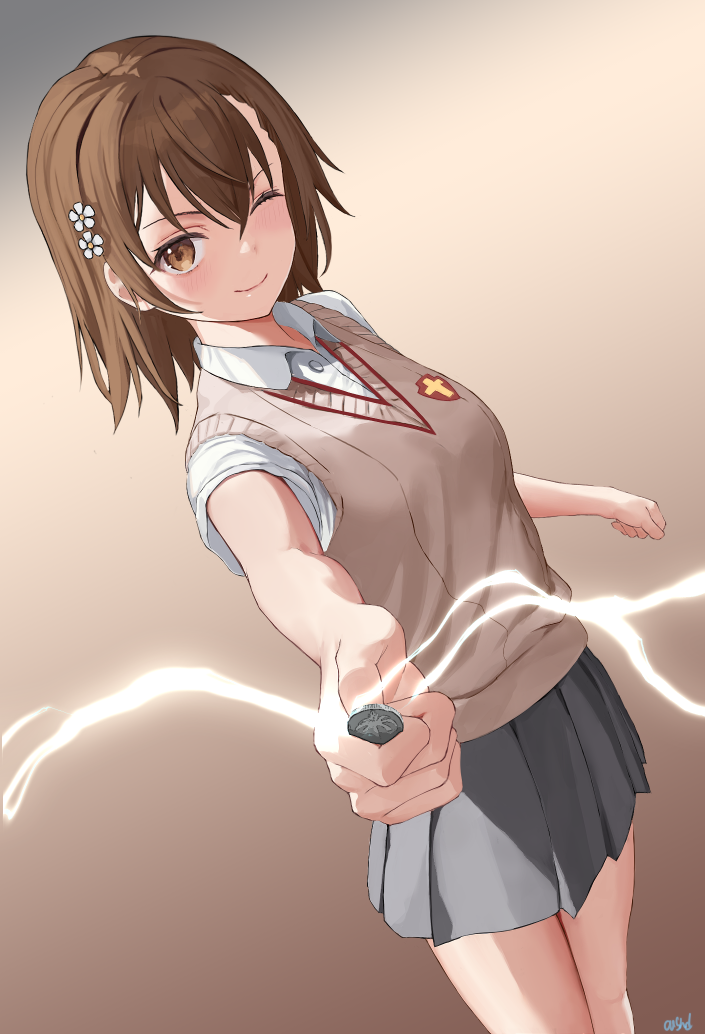 ;) aiming aiming_at_viewer artist_name asurada_yui breasts brown_eyes brown_hair brown_sweater_vest coin collared_shirt commentary_request electricity electrokinesis emblem gradient_background grey_skirt hair_between_eyes hair_ornament hairpin holding holding_coin medium_hair misaka_mikoto one_eye_closed outstretched_arm pleated_skirt psychic railgun_(misaka_mikoto) school_emblem school_uniform shirt short_sleeves simple_background skirt small_breasts smile summer_uniform sweater_vest toaru_kagaku_no_railgun toaru_majutsu_no_index tokiwadai_school_uniform white_shirt