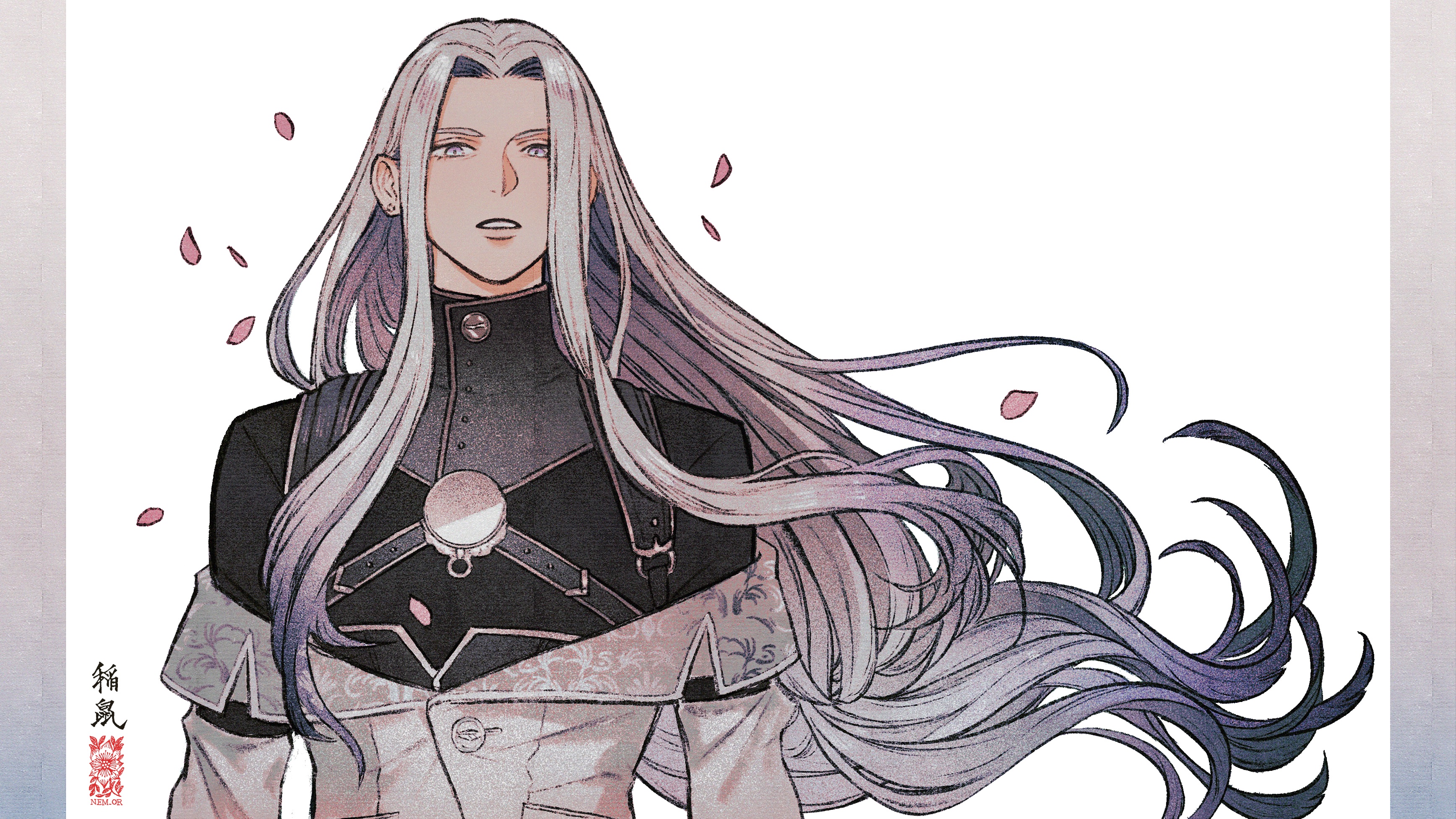 1boy absurdres black_shirt commentary floating_hair grey_hair harness high_collar highres himetsuru_ichimonji_(touken_ranbu) ine_(zx_o4) jacket long_hair looking_at_viewer male_focus off-shoulder_jacket off_shoulder parted_bangs parted_lips petals pillarboxed purple_hair shirt simple_background solo touken_ranbu upper_body very_long_hair white_background white_jacket