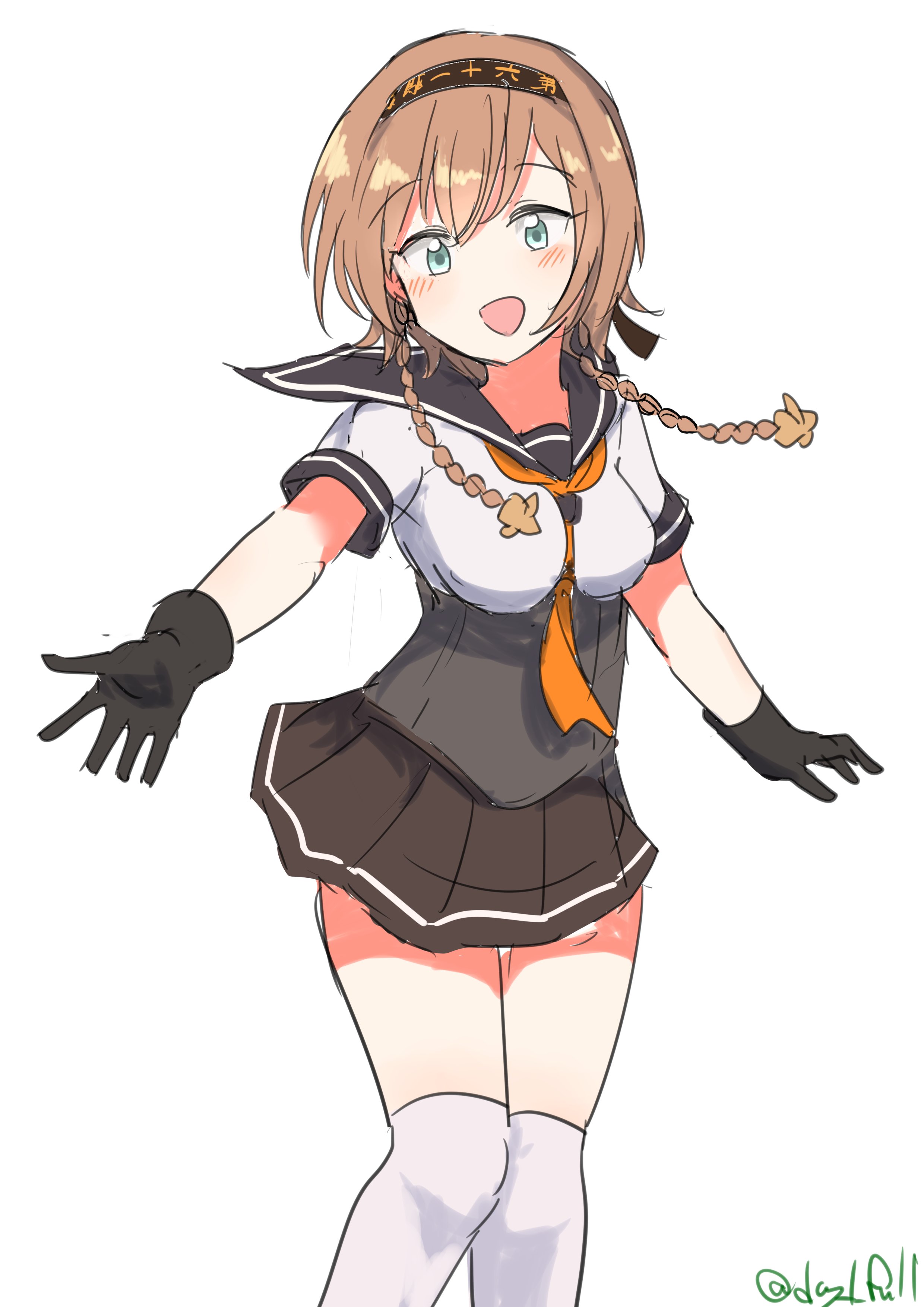 1girl absurdres black_gloves black_headband black_sailor_collar black_skirt braid breasts clothes_writing corset feet_out_of_frame gloves grey_eyes hair_ornament headband highres kantai_collection light_brown_hair long_hair looking_at_viewer medium_breasts neckerchief one-hour_drawing_challenge pleated_skirt propeller_hair_ornament robinson_(day_l_full) sailor_collar school_uniform serafuku shirt short_sleeves simple_background skirt smile solo standing teruzuki_(kancolle) twin_braids twitter_username white_background white_shirt yellow_neckerchief