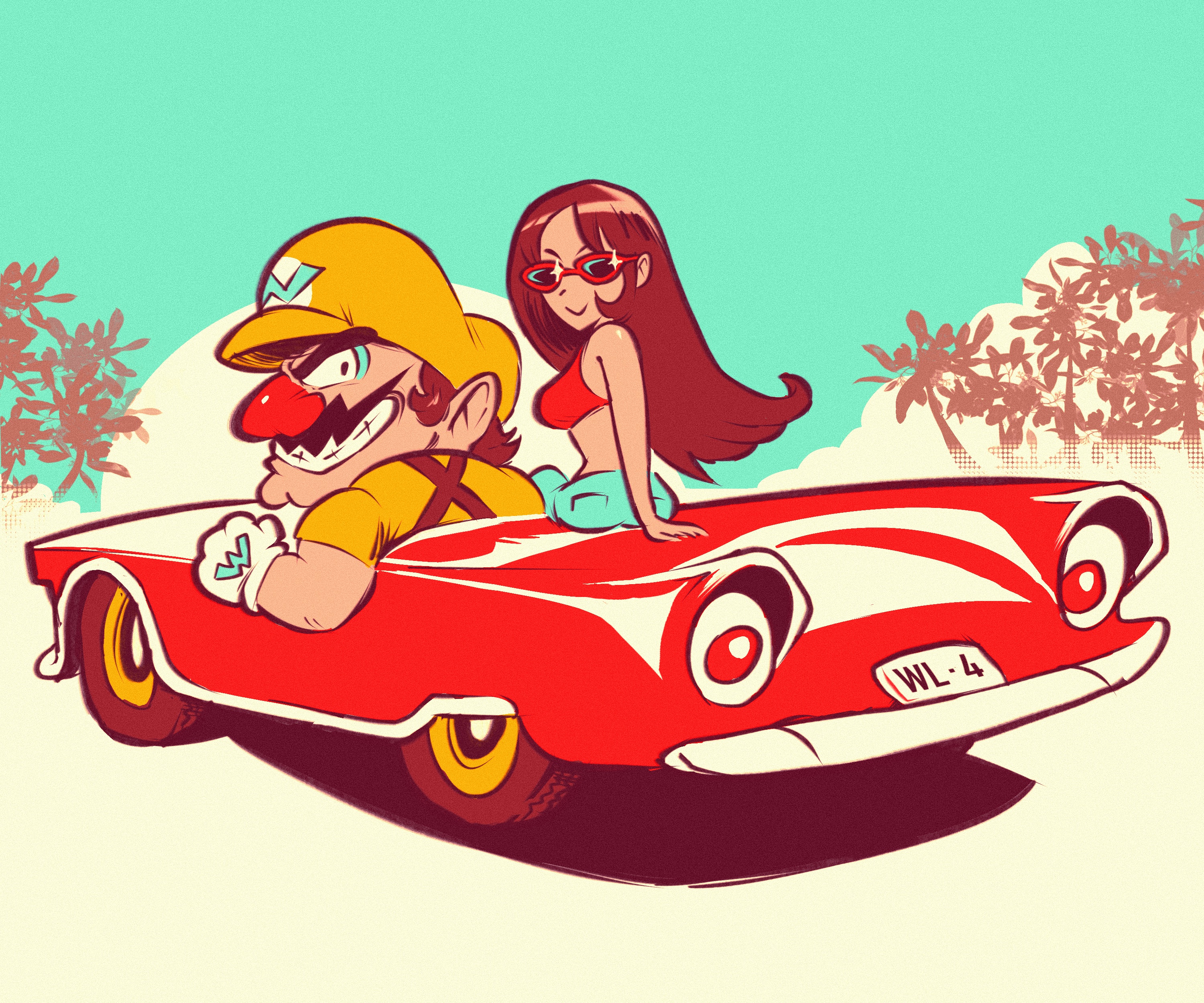 1boy 1girl :> absurdres atomiksaico bare_shoulders large_nose bikini bikini_top_only black_eyes blue_pants breasts brown_hair car cleft_chin convertible crop_top derivative_work driving facial_hair glint gloves grin hat highres large_breasts license_plate long_hair looking_at_viewer mario_(series) motor_vehicle mustache nintendo on_car outdoors overalls pants purple_overalls red-framed_eyewear red_bikini red_car shirt short_sleeves sitting smile sunglasses swimsuit t-shirt thick_eyebrows wario wario_land wario_land_4 white_gloves yellow_headwear yellow_shirt