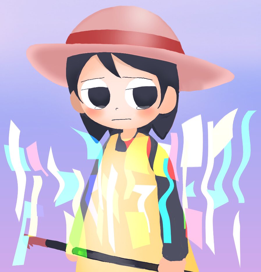 1girl andou_natsumi black_eyes black_hair black_shirt blush closed_mouth commentary_request copyright_name cowboy_shot crowbar distortion dress hat holding holding_crowbar light_frown long_sleeves looking_at_viewer medium_hair natsumi_step! no_pupils pinafore_dress purple_background shirt simple_background sleeveless sleeveless_dress solo straw_hat tearing_up two-handed yasashii_naizou