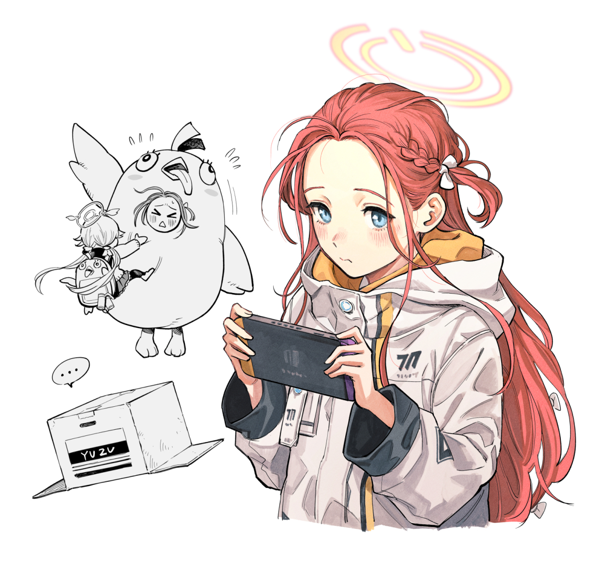>_< ... 2girls backpack bag blue_archive blue_eyes blush closed_mouth flying_sweatdrops halo handheld_game_console hifumi_(blue_archive) hiro_(chumo) holding holding_handheld_game_console hood hood_down hooded_jacket jacket long_hair long_sleeves low_twintails multiple_girls multiple_views nintendo_switch peroro_(blue_archive) playing_games playing_video_games red_hair simple_background spoken_ellipsis triangle_mouth twintails white_background white_jacket yellow_halo yuzu_(blue_archive)