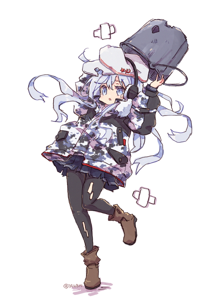 1girl black_pantyhose black_skirt boots brown_boots bucket camouflage camouflage_jacket earmuffs flat_cap full_body grey_eyes hat hibiki_(kancolle) holding jacket kantai_collection long_hair miko_(35nikomi) pantyhose pleated_skirt skirt solo torn_clothes torn_pantyhose verniy_(kancolle) verniy_(saury_festival)_(kancolle) white_hat