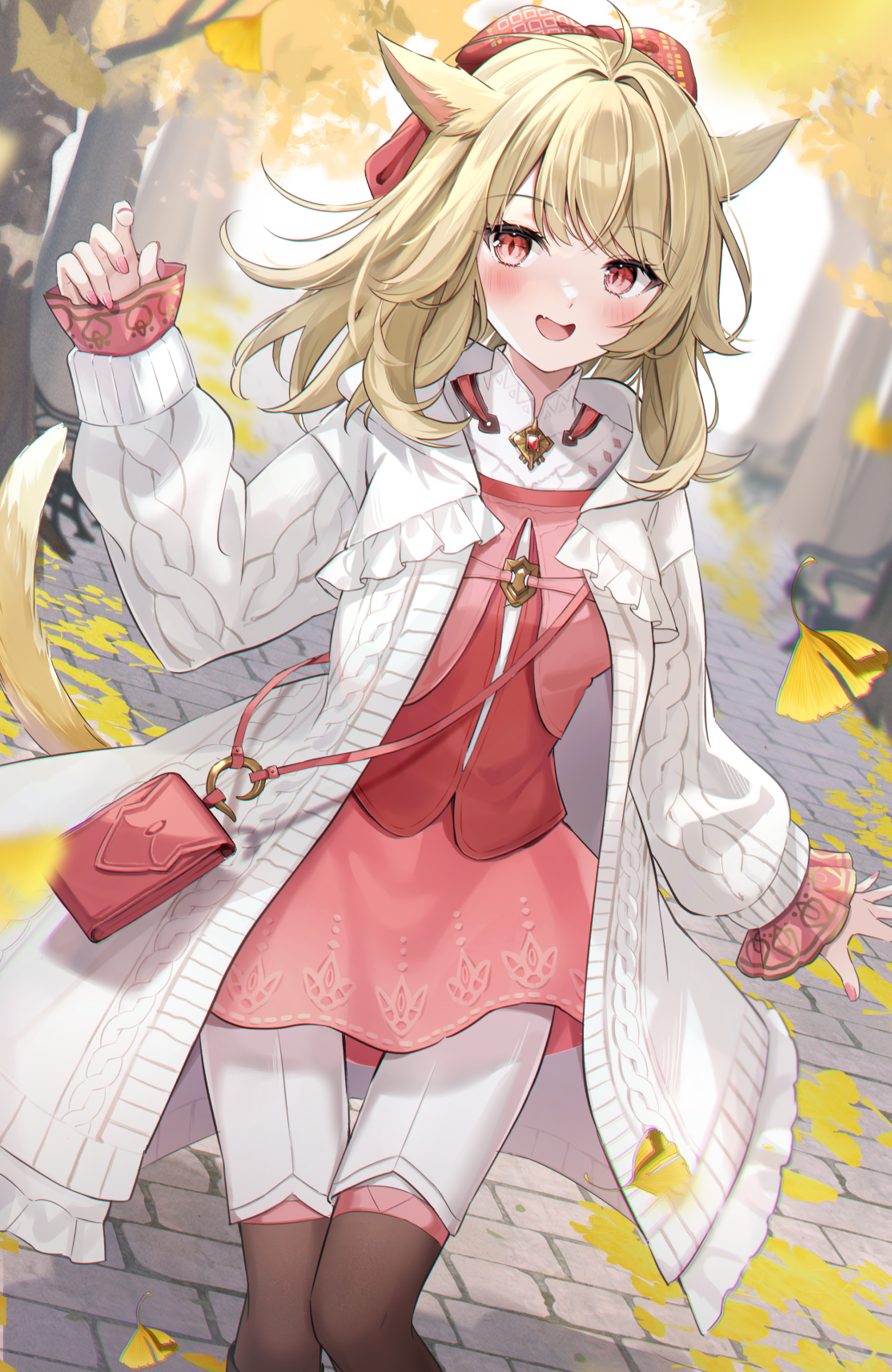 1girl animal_ears autumn_leaves blonde_hair blush brick_floor cardigan cat_ears cat_girl cat_tail commentary_request commission falling_leaves fang final_fantasy final_fantasy_xiv ginkgo_leaf highres leaf long_sleeves looking_at_viewer medium_hair miqo'te open_cardigan open_clothes open_mouth outdoors puffy_long_sleeves puffy_sleeves red_eyes skeb_commission skin_fang solo suzumori_(su2525) tail tree white_cardigan