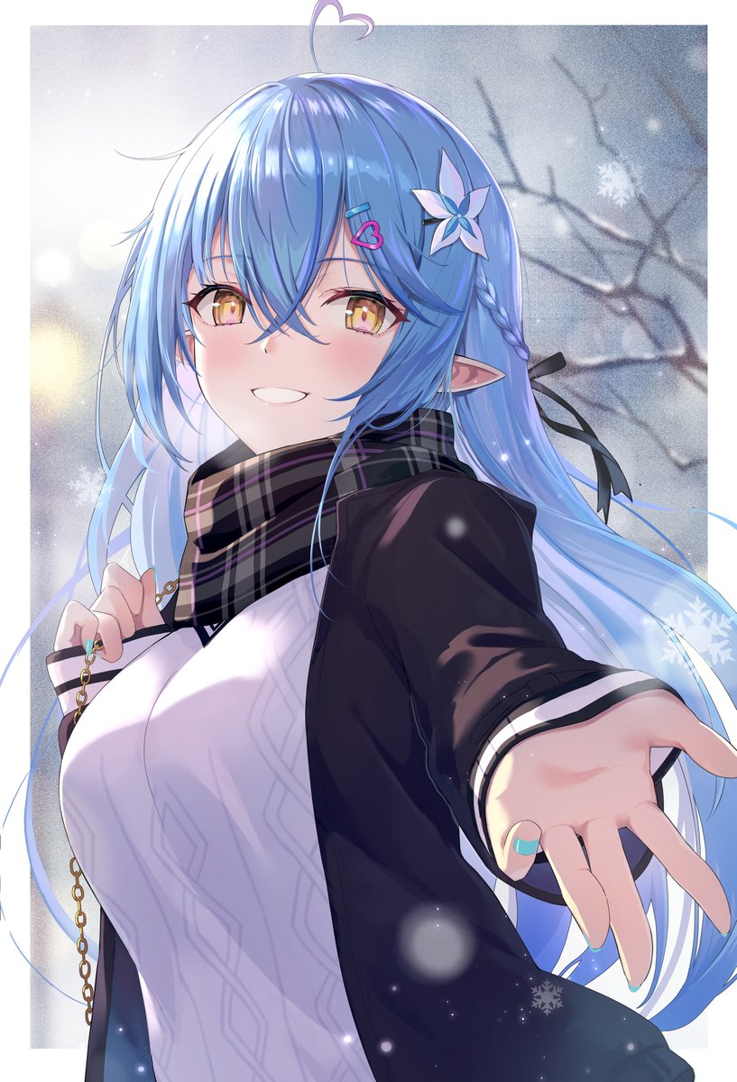 1girl ahoge alternate_costume bag beckoning black_jacket black_scarf blue_hair blue_nails blush braid breasts cable_knit colored_tips commentary crossed_bangs double-parted_bangs flower grin hair_between_eyes hair_flower hair_ornament hairclip half_updo handbag heart heart_ahoge heart_hair_ornament highres hololive jacket large_breasts long_hair looking_at_viewer multicolored_hair nail_polish offering_hand open_clothes open_jacket plaid_clothes plaid_scarf pointy_ears reaching reaching_towards_viewer scarf smile snowing solo streaked_hair sweater tokisaka_makoto upper_body very_long_hair virtual_youtuber white_sweater winter yellow_eyes yukihana_lamy