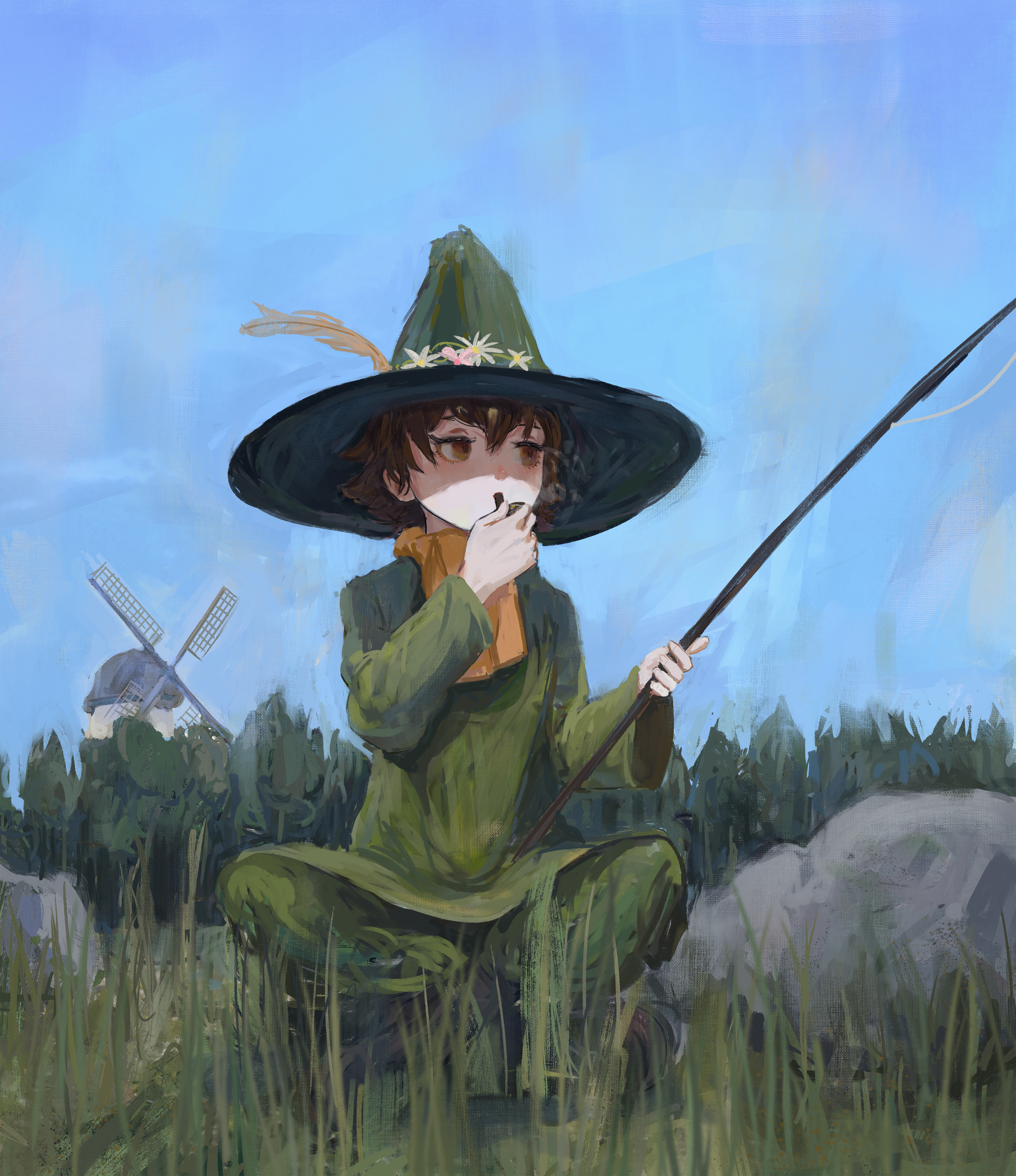 1boy absurdres elainma flower grass green_hat green_pants green_shirt hat hat_flower highres landscape moomin pants scarf shirt sketch smoke smoking smoking_pipe snufkin solo squatting windmill yellow_scarf