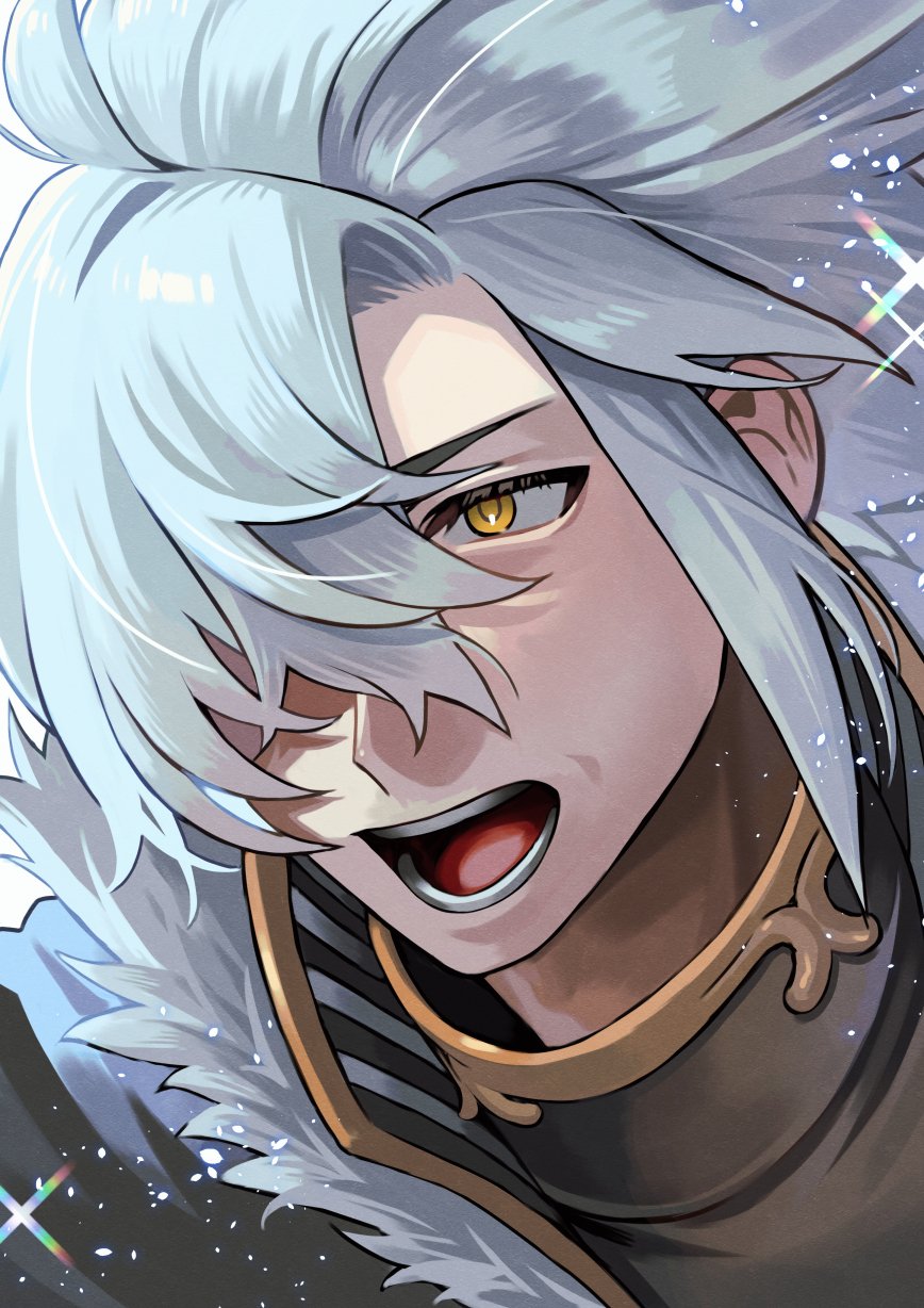 1boy akagi_kurage black_cloak cloak close-up commentary emperor_(sennen_sensou_aigis) fur-trimmed_cloak fur_trim gold_trim hair_over_one_eye highres long_bangs male_focus open_mouth parted_hair sennen_sensou_aigis solo sparkle teeth upper_body v-shaped_eyebrows white_hair yellow_eyes
