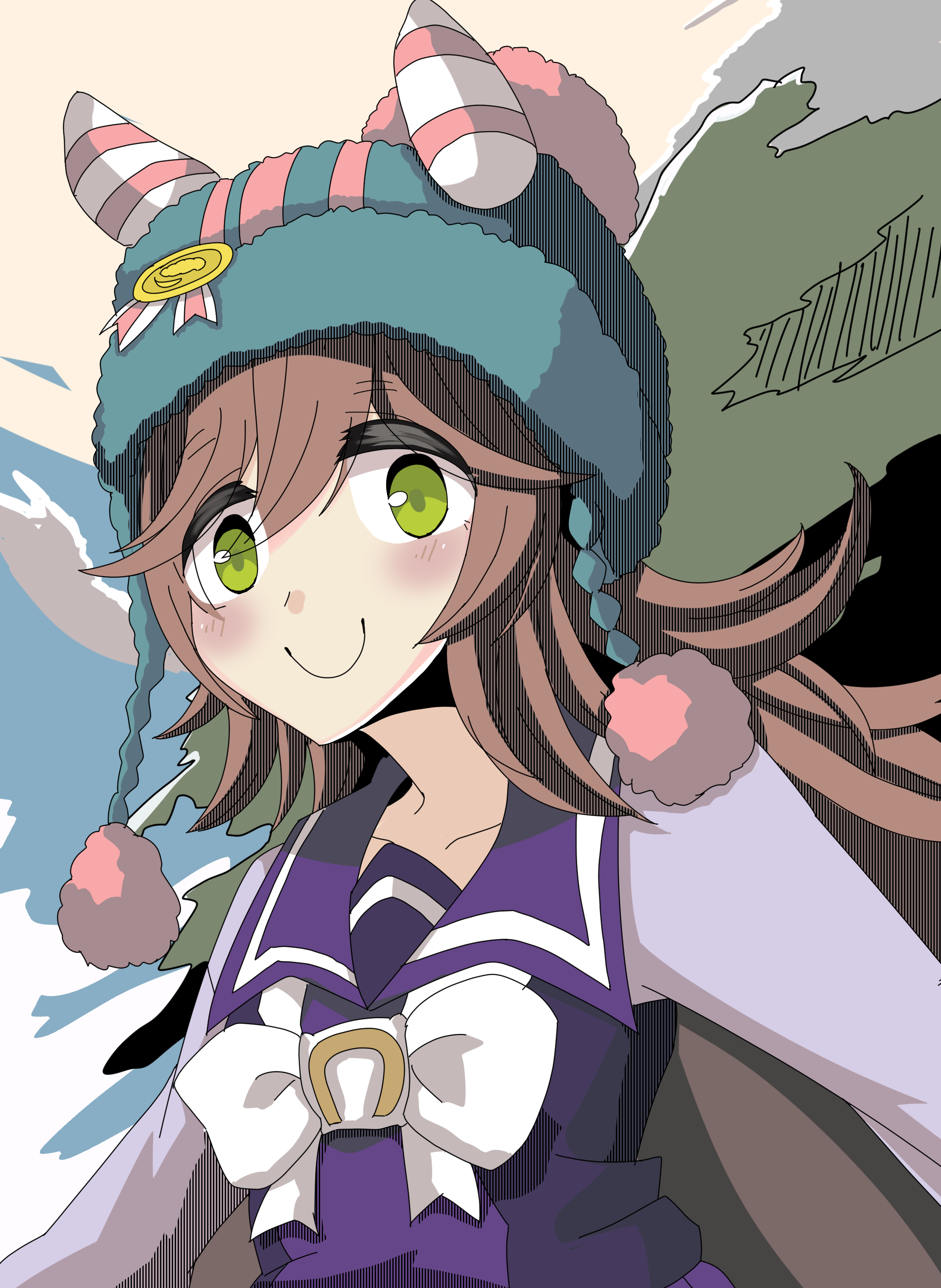 1girl absurdres beanie brown_hair commentary_request green_eyes hair_between_eyes hair_ornament hat highres horse_girl long_hair looking_at_viewer pom_pom_(clothes) portrait ribbon samson_big_(umamusume) school_uniform shinonome_halltro sky smile solo tracen_school_uniform umamusume