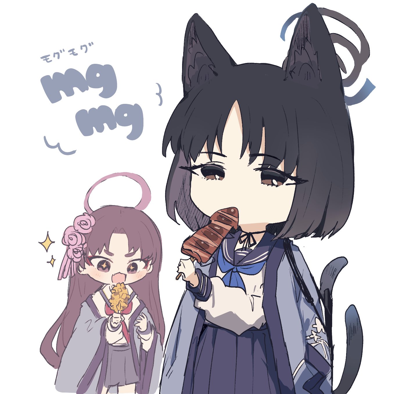 2girls black_hair black_sailor_collar black_skirt blue_archive blue_halo brown_eyes eating flower food hair_flower hair_ornament halo haori highres holding holding_food ikayaki japanese_clothes kikyou_(blue_archive) long_hair long_sleeves multiple_girls neckerchief pink_flower pleated_skirt purple_eyes purple_hair purple_halo red_neckerchief sailor_collar school_uniform serafuku short_hair simple_background skirt white_background white_sailor_collar wotakana_s yukari_(blue_archive)